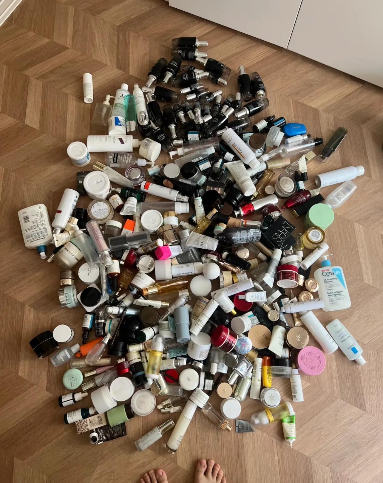 沒錯,我家裏有各種各樣護膚品的空瓶子,倒在地上,能近乎鋪滿半個房間。