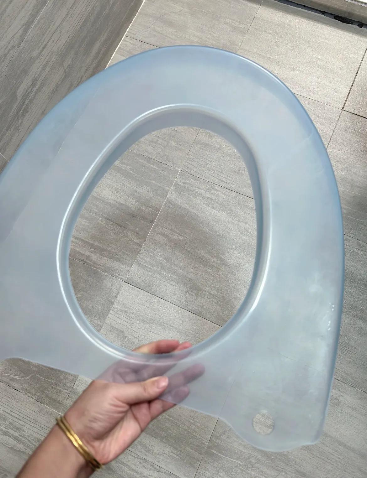 這個硬質塑料馬桶座圈,它不像其它馬桶墊那樣滲水、粘污,也不像一次性馬桶圈那樣要手動去套。