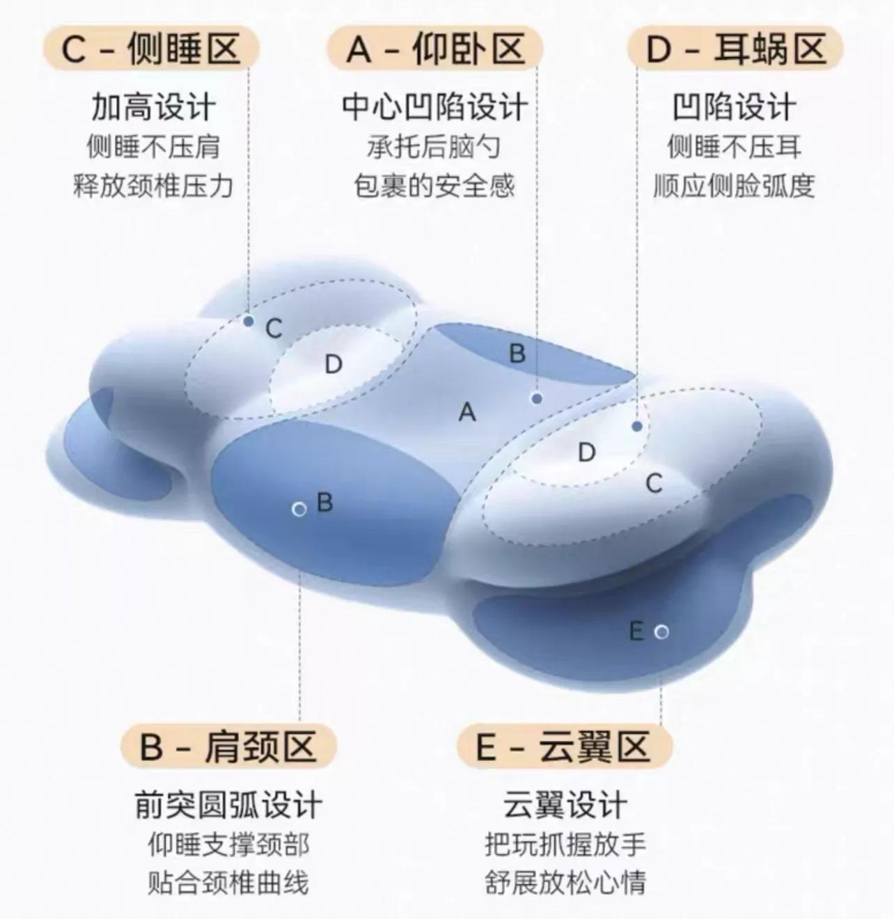 c區側睡區,做了加高設計,讓側睡也能不壓肩,還有2個耳蝸區,剛好放耳朵,側睡不壓耳,E區還有兩個雲翼設計,可以讓小孩抓握放鬆,也有助於小孩睡姿更標準。