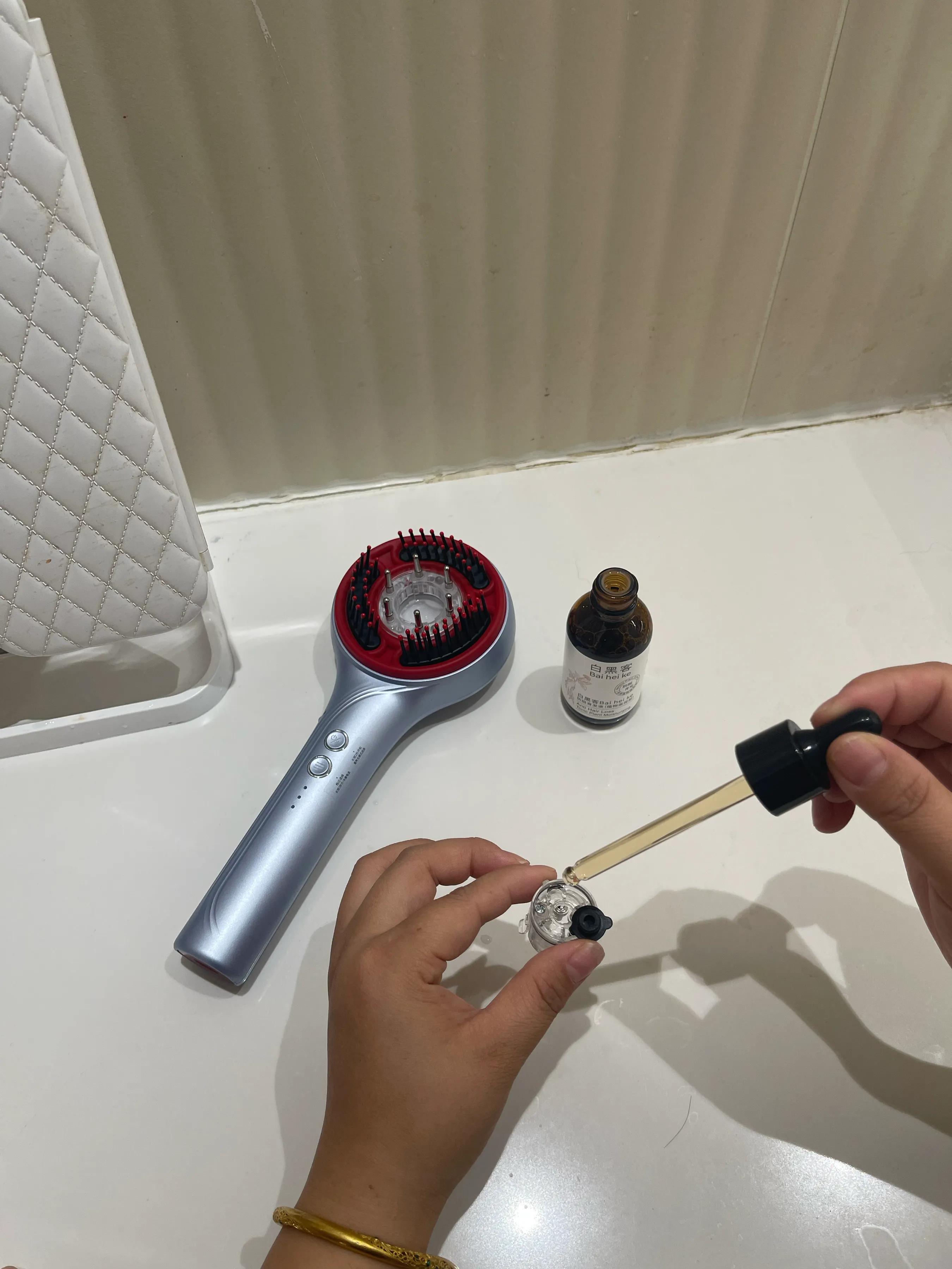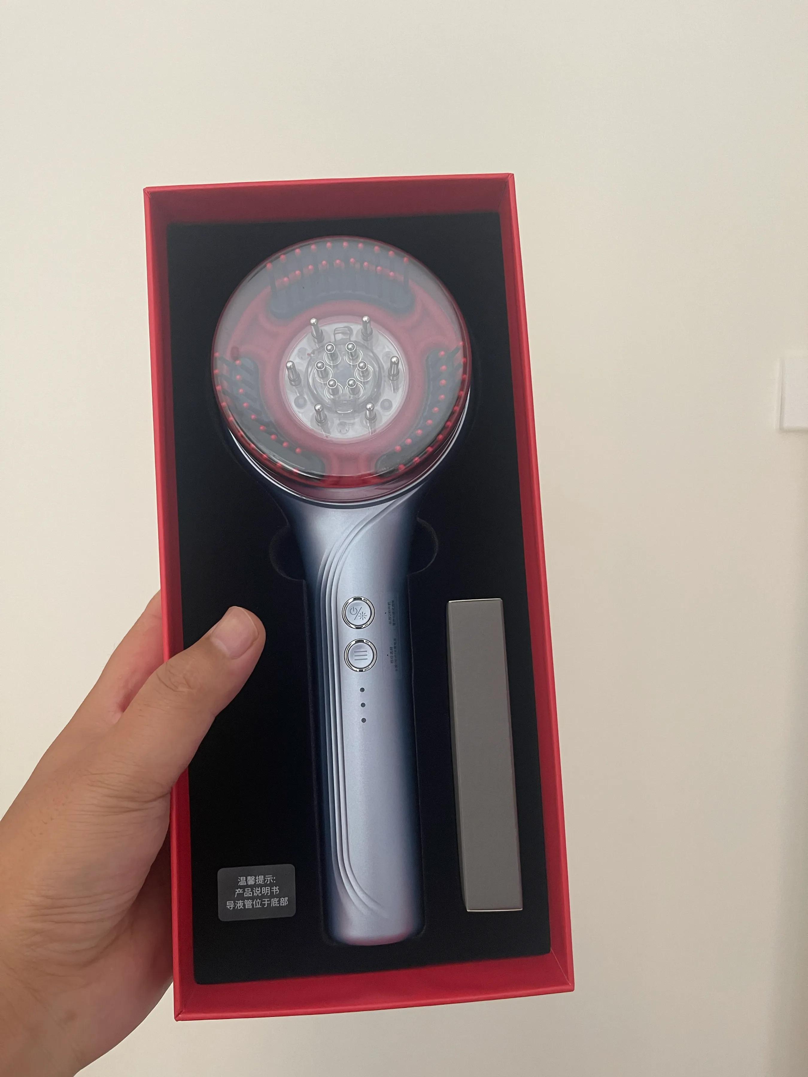就可以邊梳頭,邊搽精華液或米諾地爾,邊進行抓揉按摩,邊利用紅光+微電流養護頭皮了。