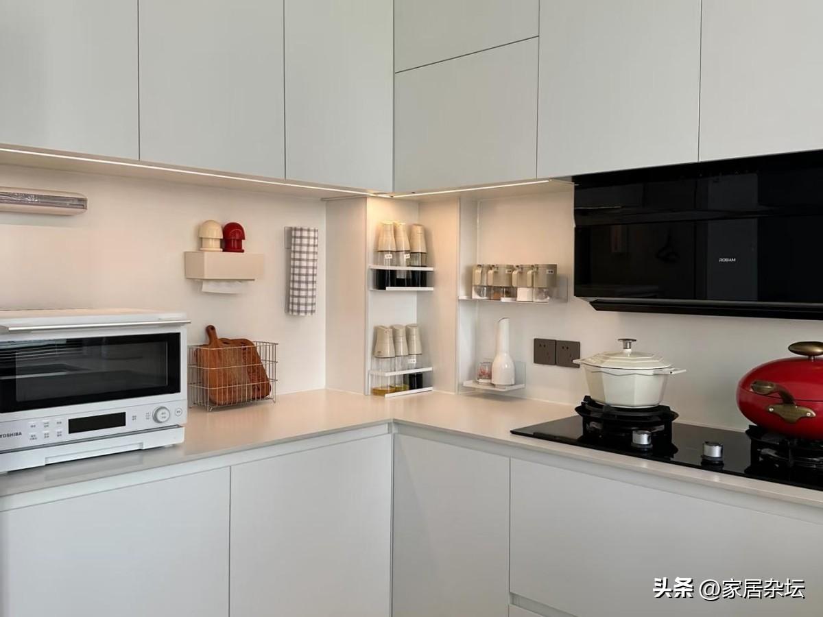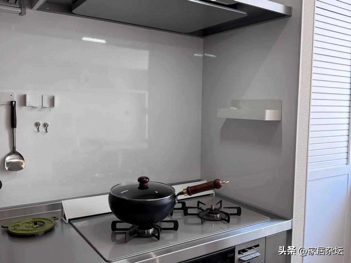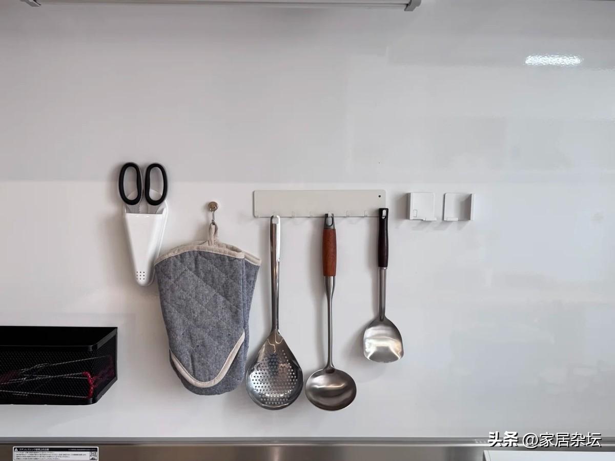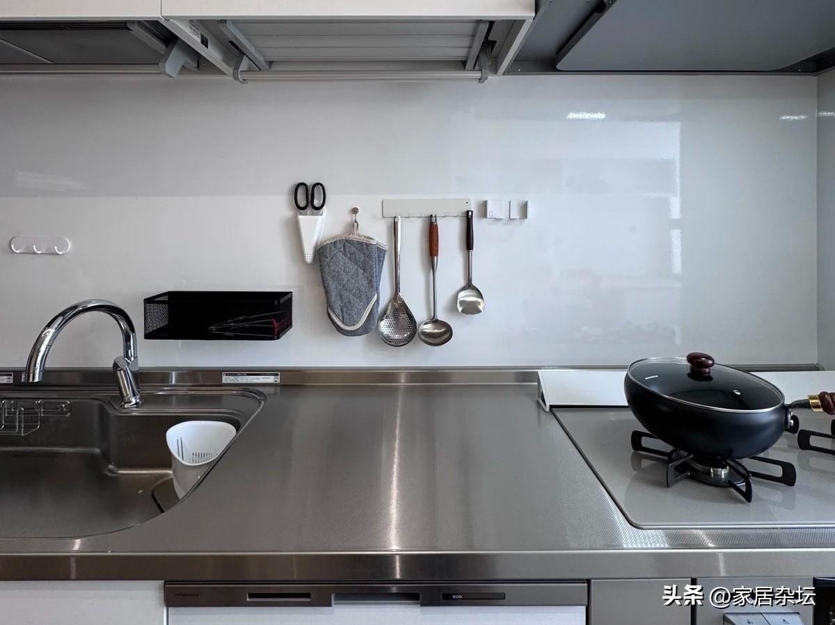 如果我們想實現牆面無瓷磚效果,而且又想省錢,其實使用隱藏磚加琺琅板搭配,是非常完美的方案。而且,後期使用磁吸置物架,又解決了廚房檯面收納的問題,一舉兩得。