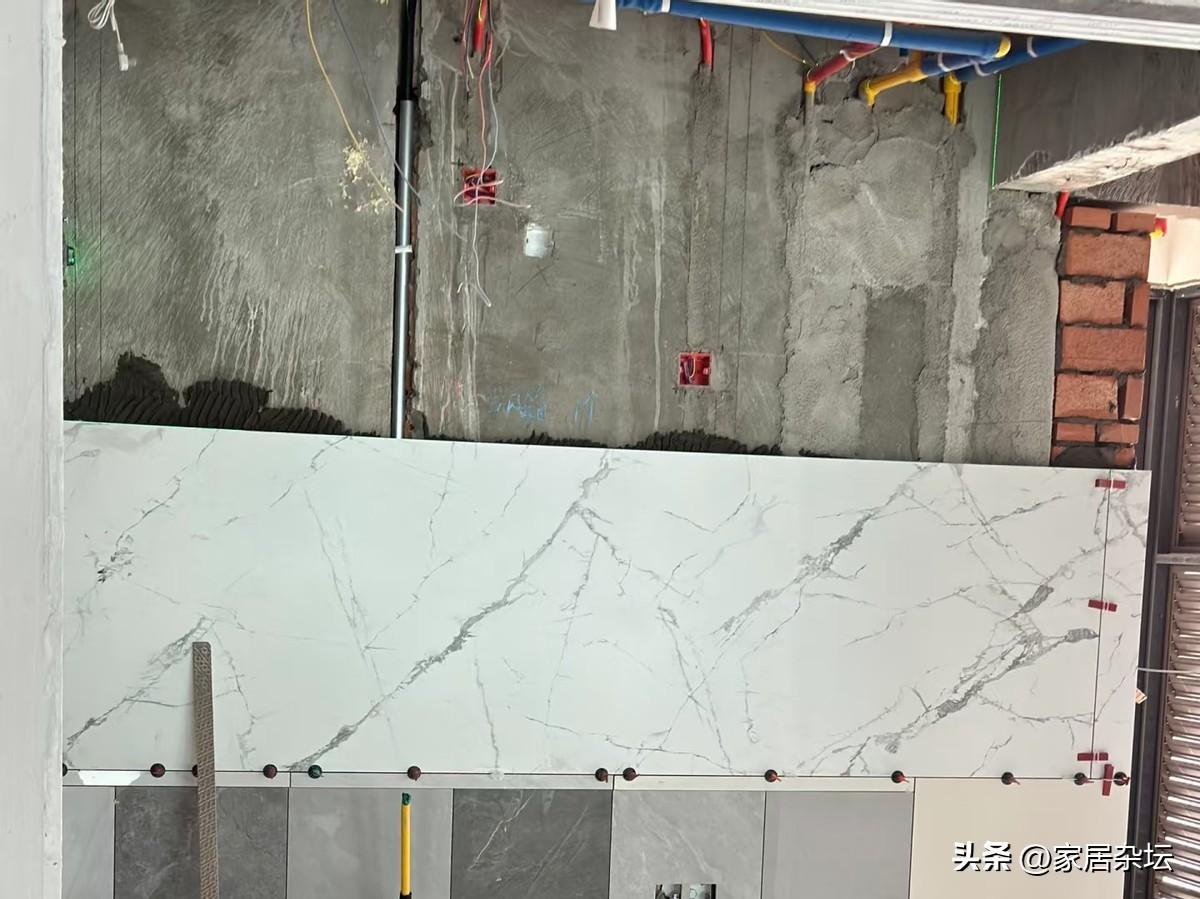 如果我們想省錢,那麼就把隱藏的區域粘貼隱藏磚。也就是一些廉價的瓷磚,不用太好,只要把這個位置貼結實就可以。而對於外露的部分,就粘貼高級的巖板。