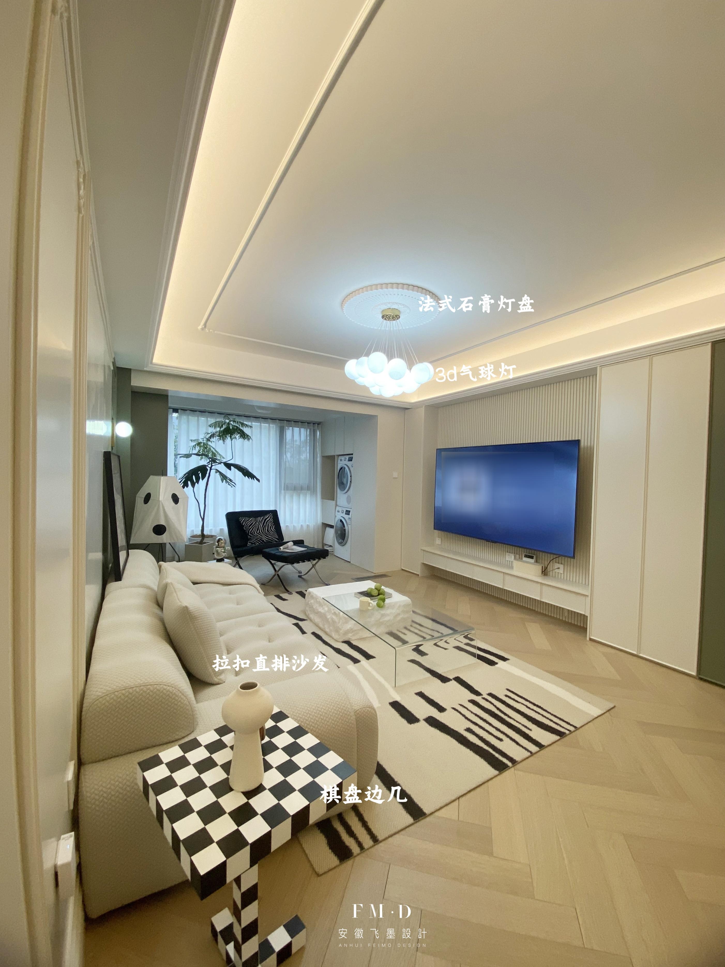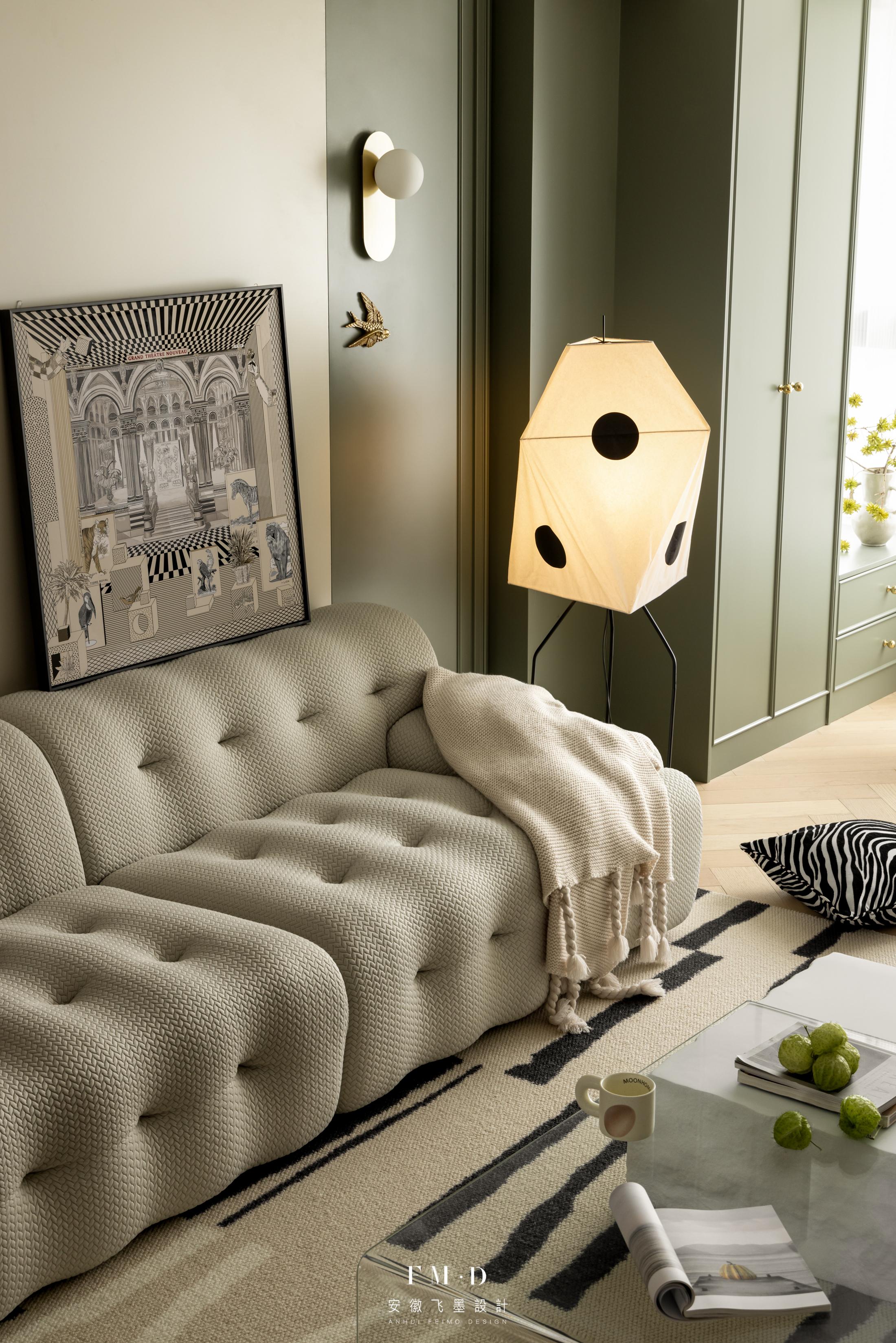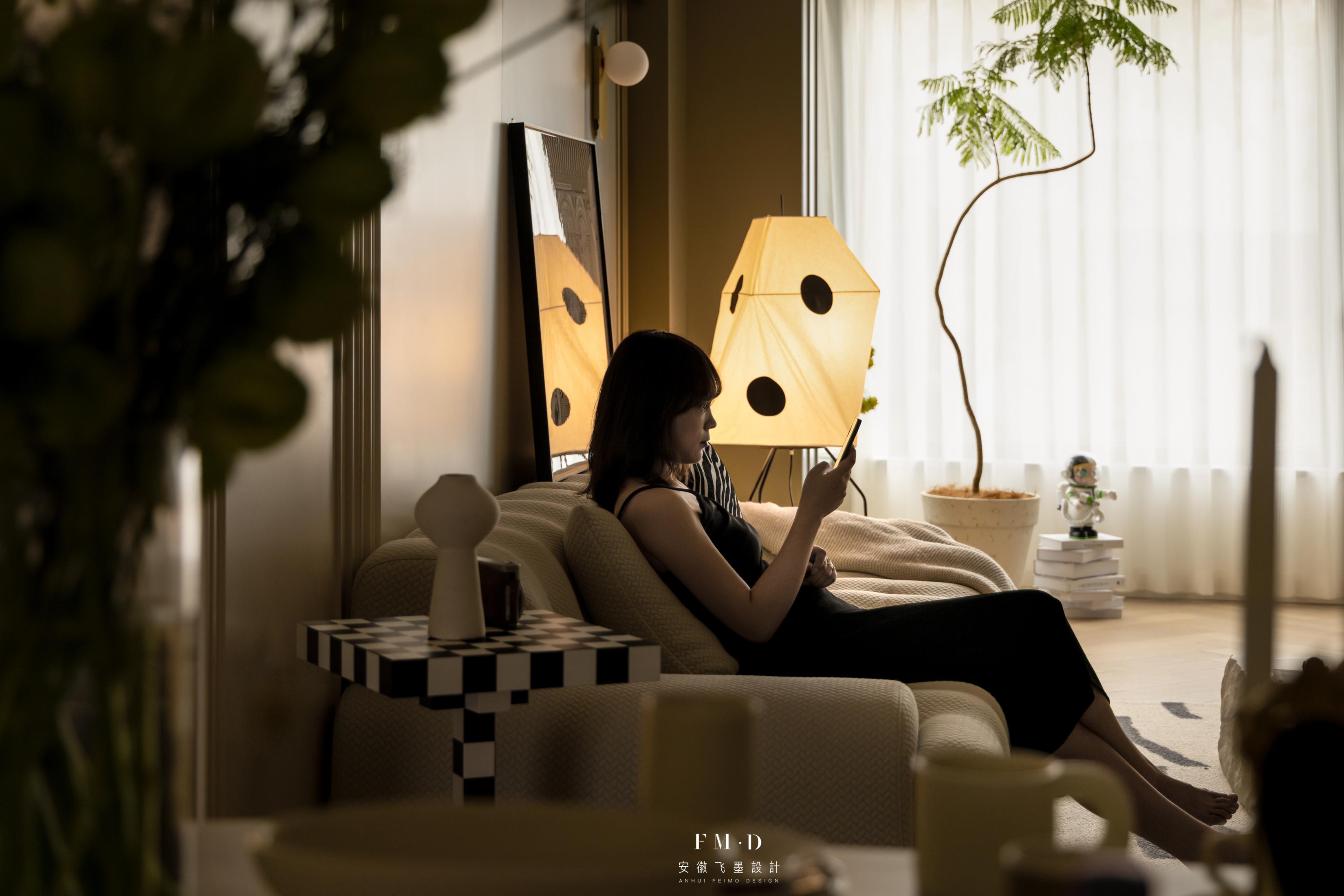 3、另外的棋盤格邊幾、地毯、落地燈和單人椅全都選擇帶黑色元素,能中和大面積奶白色的單調感。