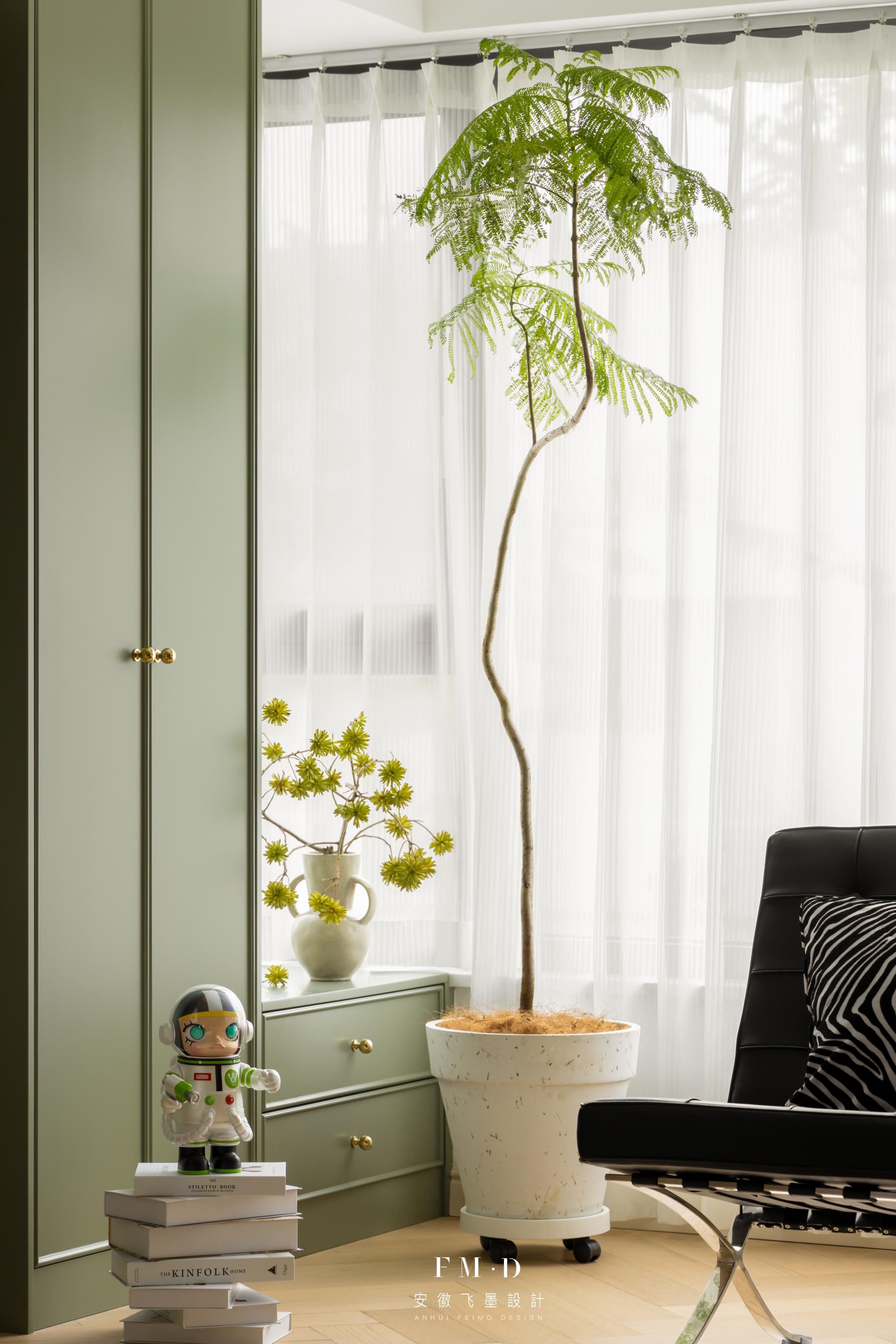 4、陽臺打通擴入客廳,原本移門位置用了護牆板和櫃門同材質同顏色的混油護牆板包裹,整體性更好,側邊定製了高低櫃(木器漆色號:薄暮),集裝飾、休閒和收納多種功能爲一體。