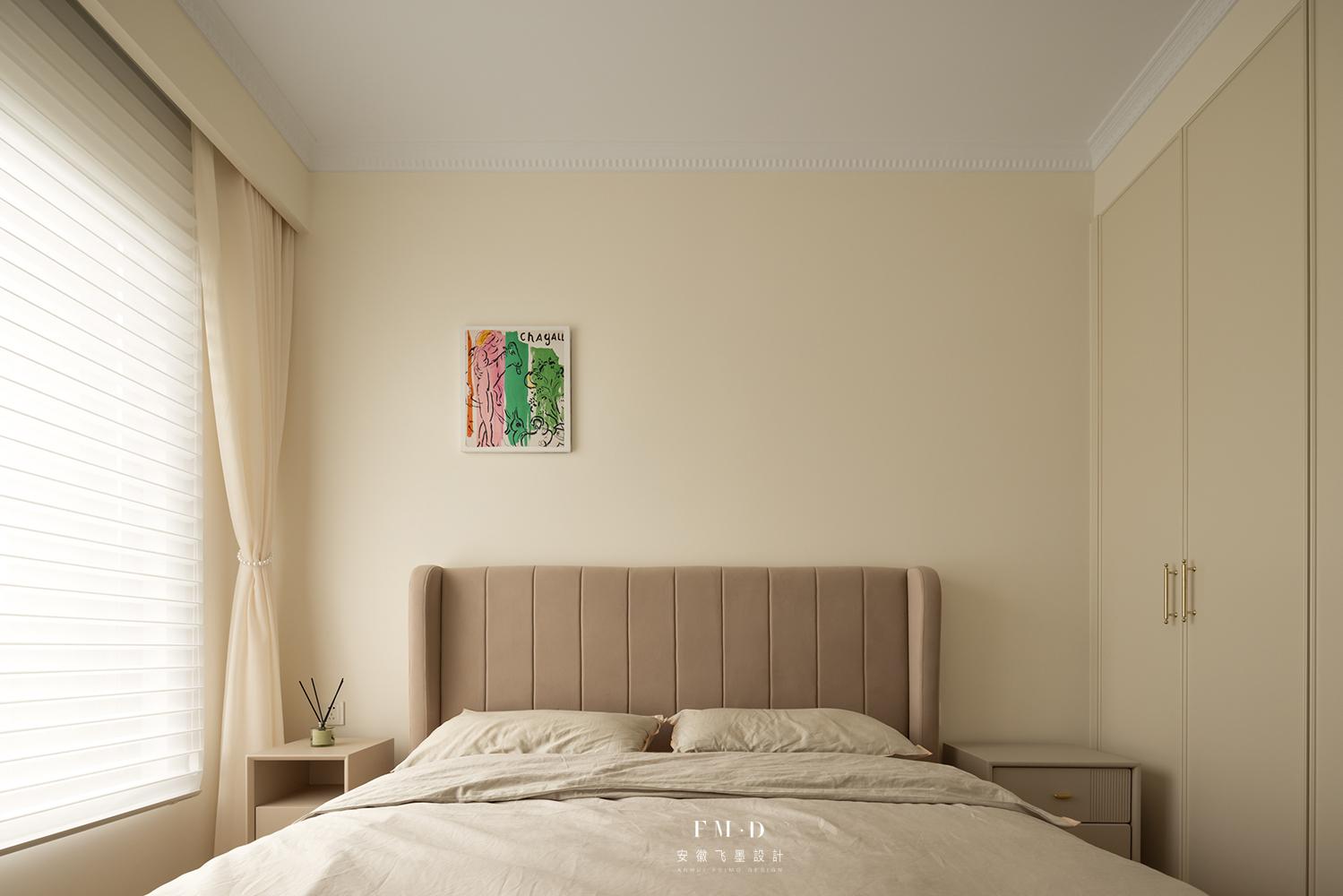 次臥面積,整體佈局很規整,背景牆刷上純色乳膠漆(色號:杏子灰),雙人牀一側設計滿牆衣櫃,中間留出開關櫃門的空間。