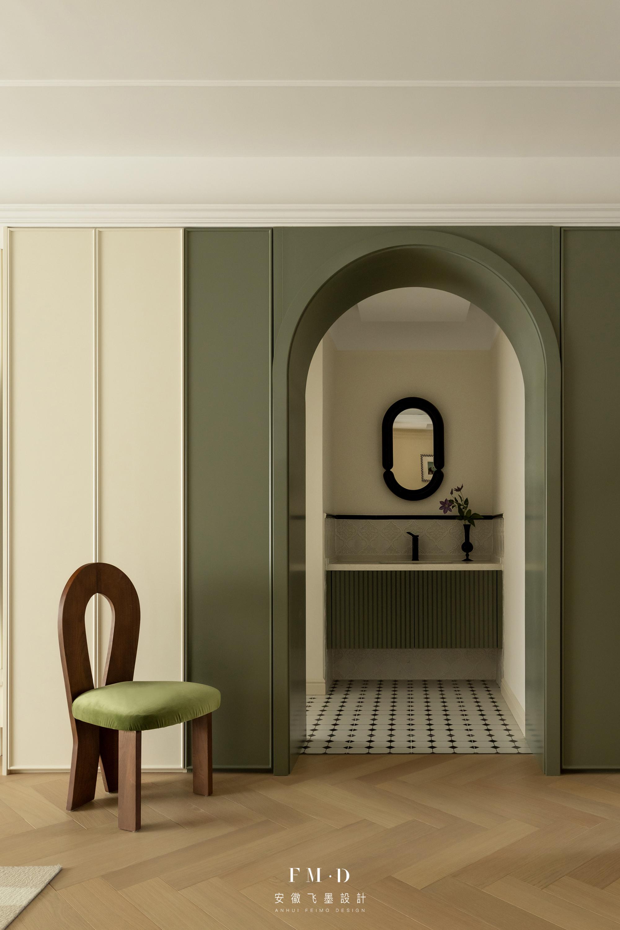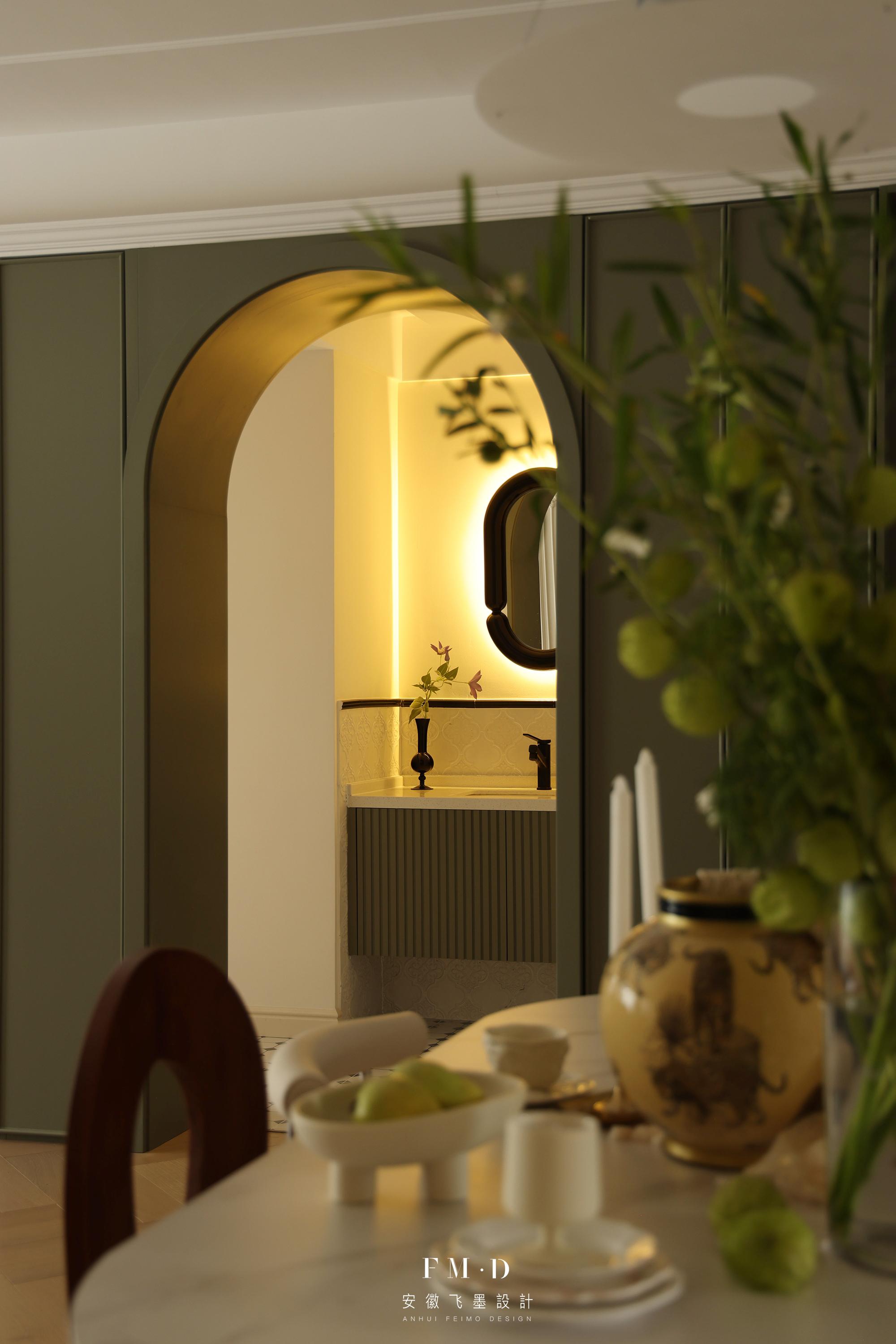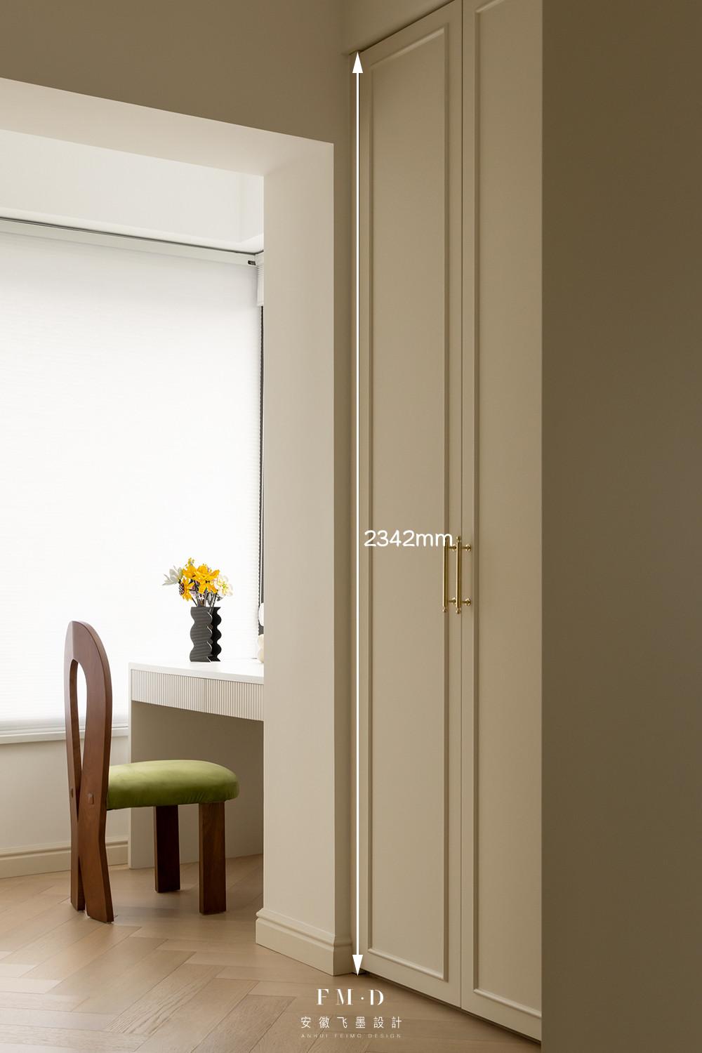 3、利用主衛門口設計過道式衣帽間,利用拱形門洞做分區,兩側牆壁定製到頂衣櫃,尺寸2580*2400mm,動線流暢收納空間充足。