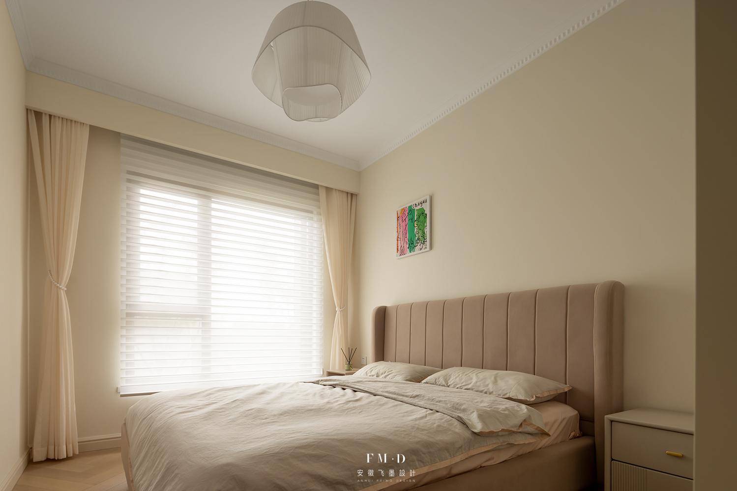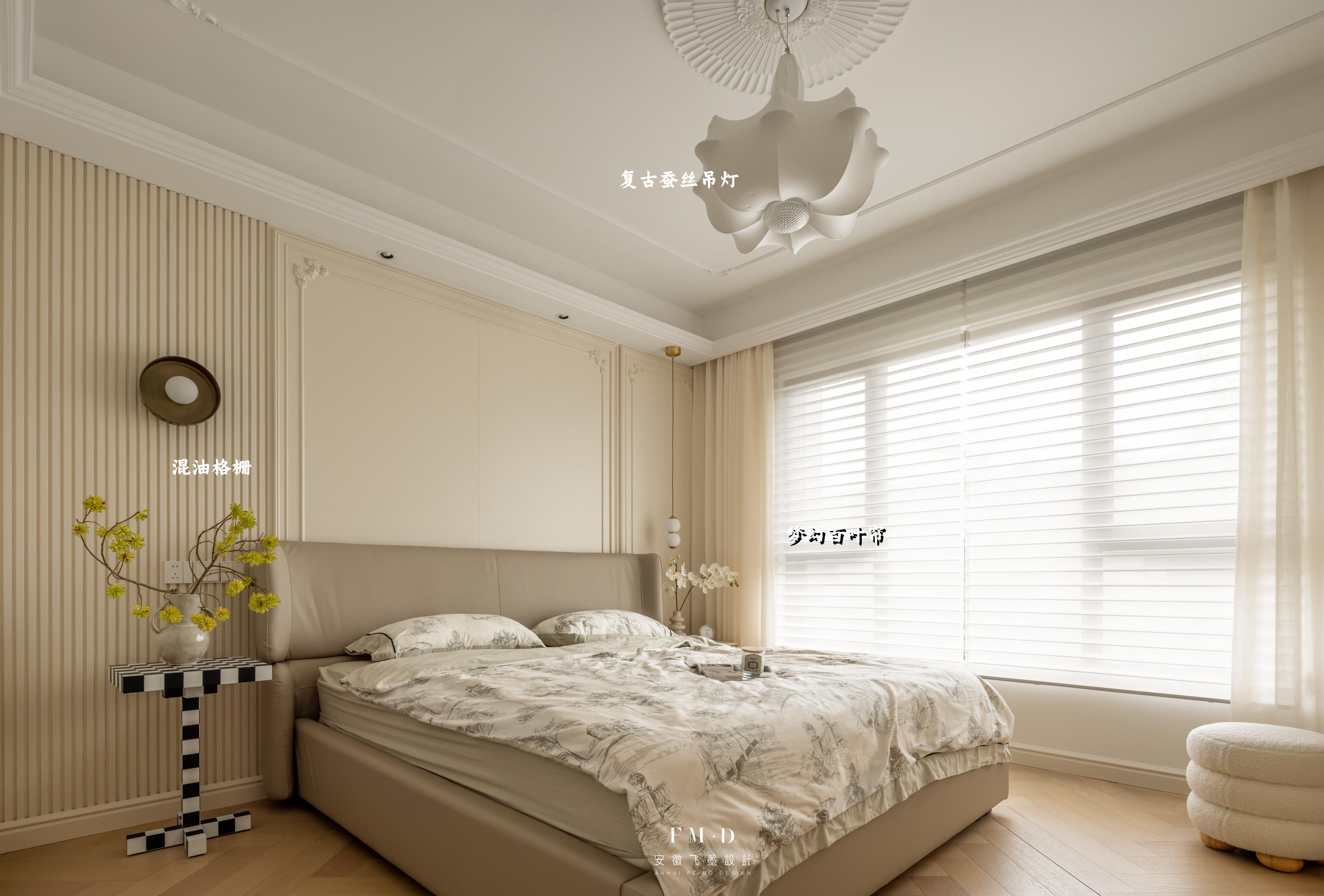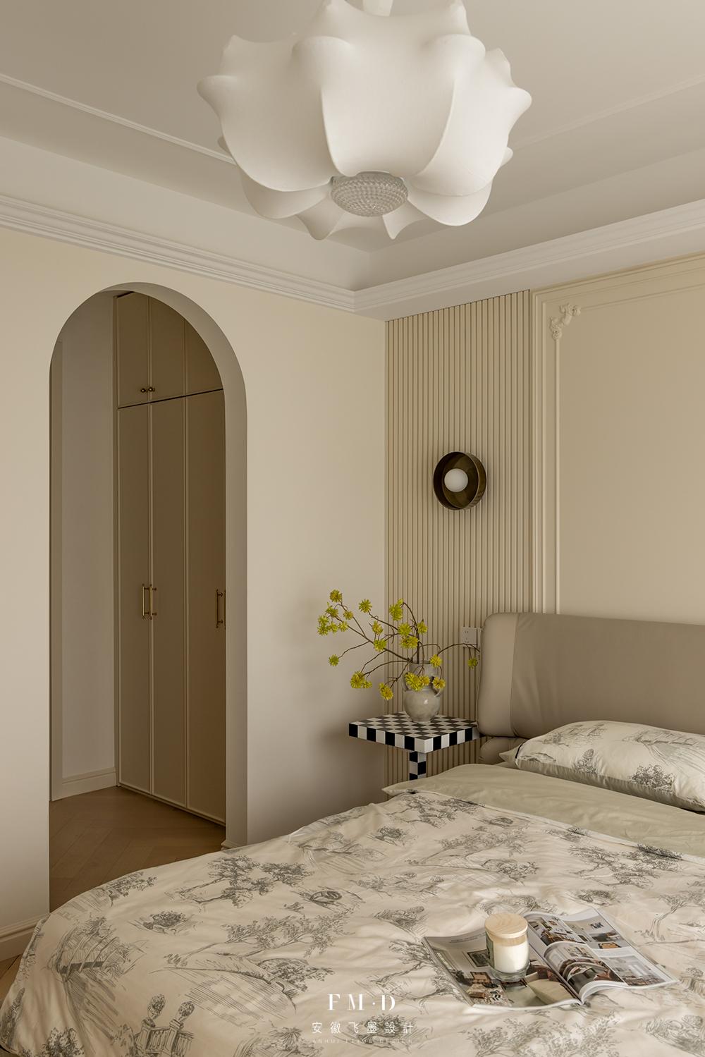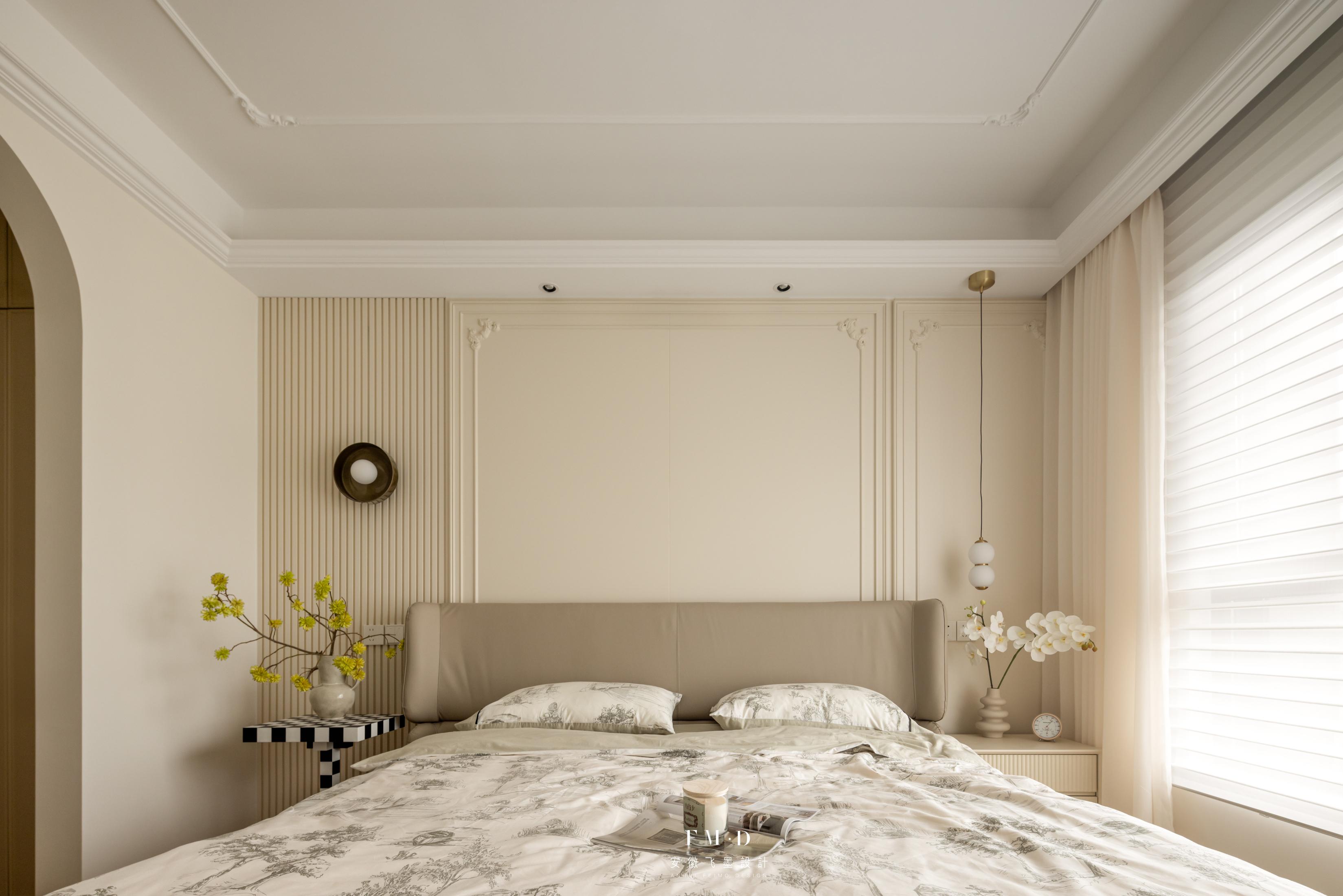 1、主臥套房整體延續了客廳的氛圍,背景牆採用抽縫造型和護牆板結合,不對稱設計更有個性美感。