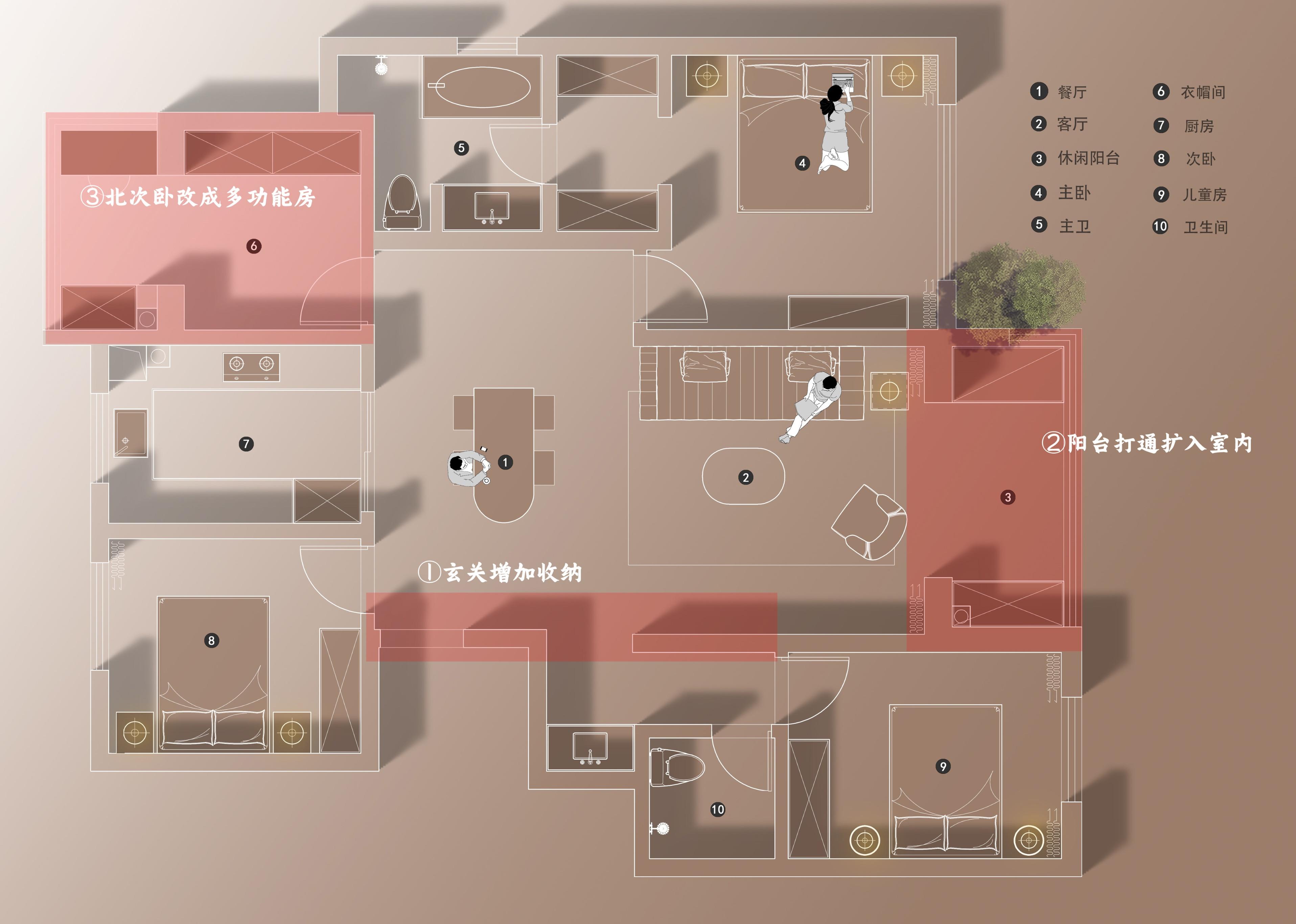 ③保留3間臥室,帶陽臺的北次臥改造成獨立衣帽間+書房,多功能使用;