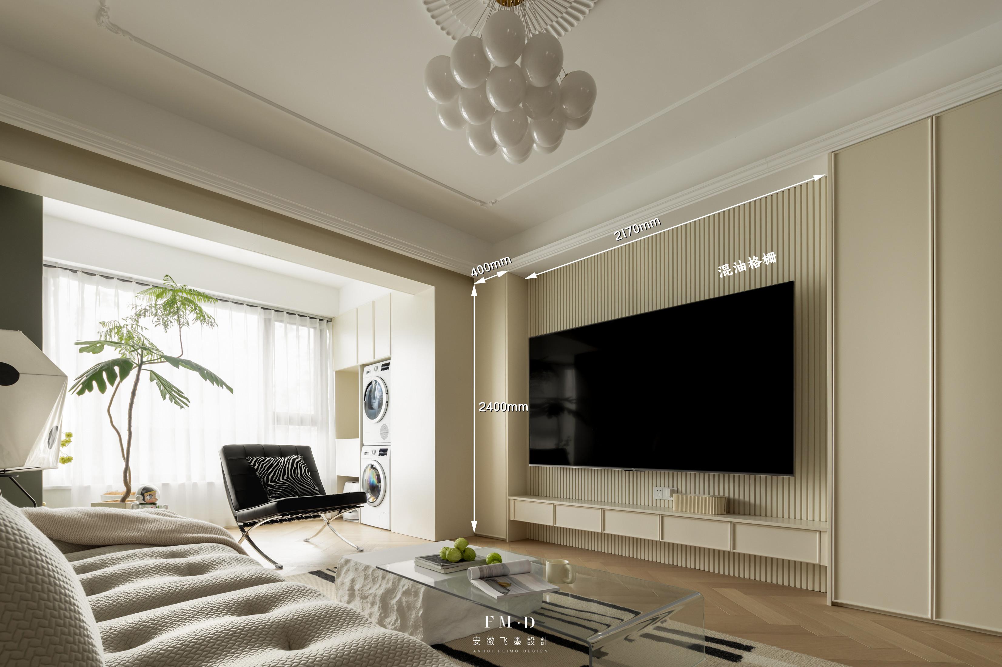3、電視背景牆選擇了混油格柵裝飾+定製櫃體,整體長2米1,左側到頂櫃體尺寸400*2400mm,底部抽屜懸空20公分,保證充足收納,也更好打理。
