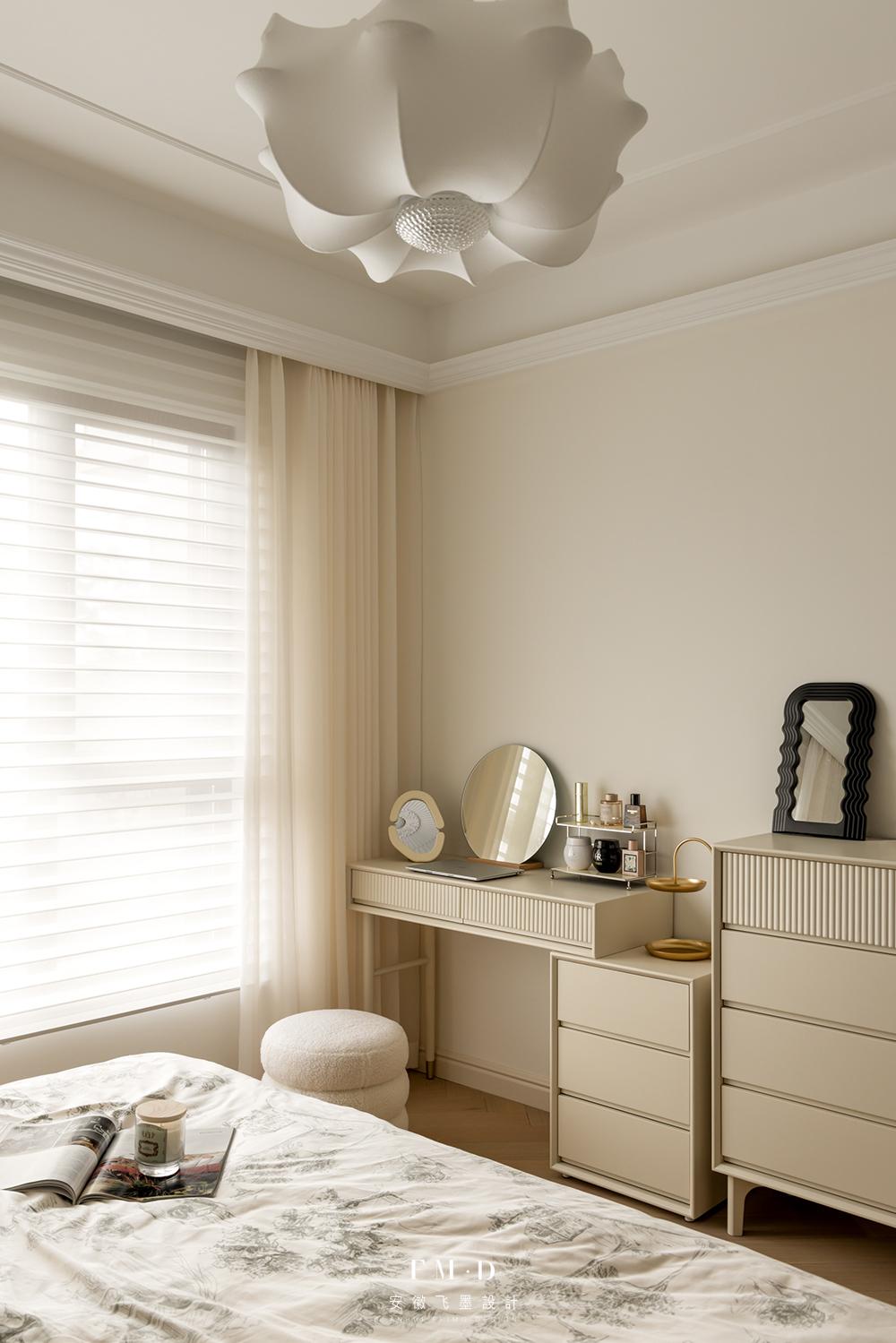 2、牀尾還增加了梳妝檯和收納功能,留出1米左右寬的過道,自由走動不壓抑。