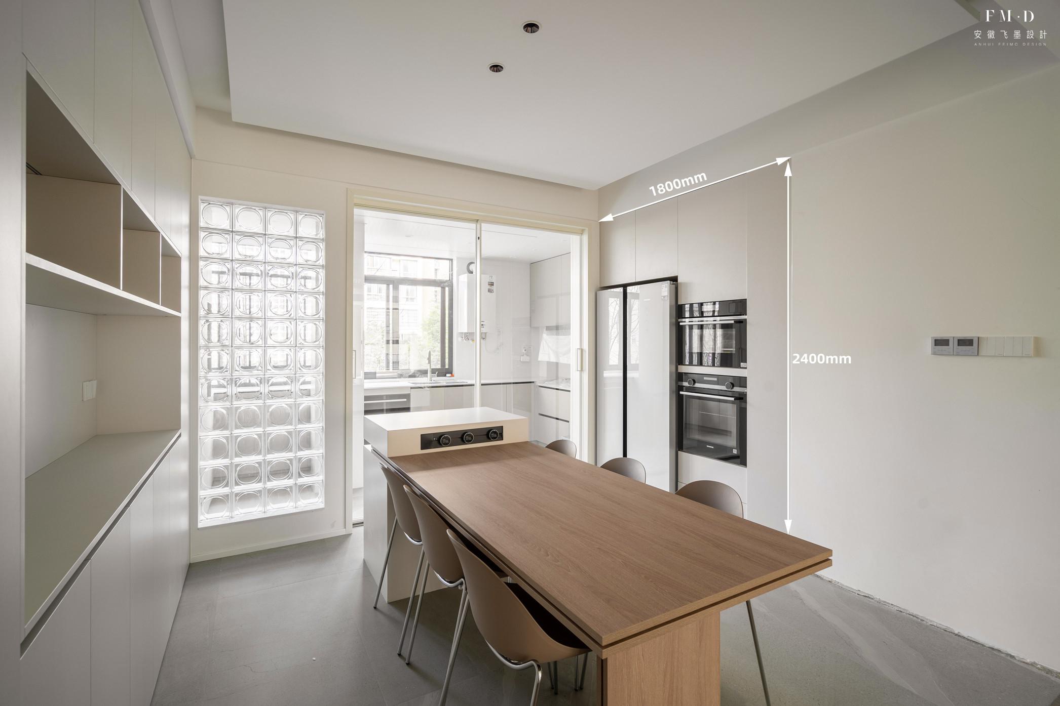 外面餐廳中間是島臺+餐桌一體式,兩側牆壁全都定製儲物櫃,左邊是餐邊櫃(3000*24000mm)右邊是嵌入式電器櫃(1800*2400mm),收納空間充足,也能當西廚使用,相比較之前實用性能提升好幾倍!