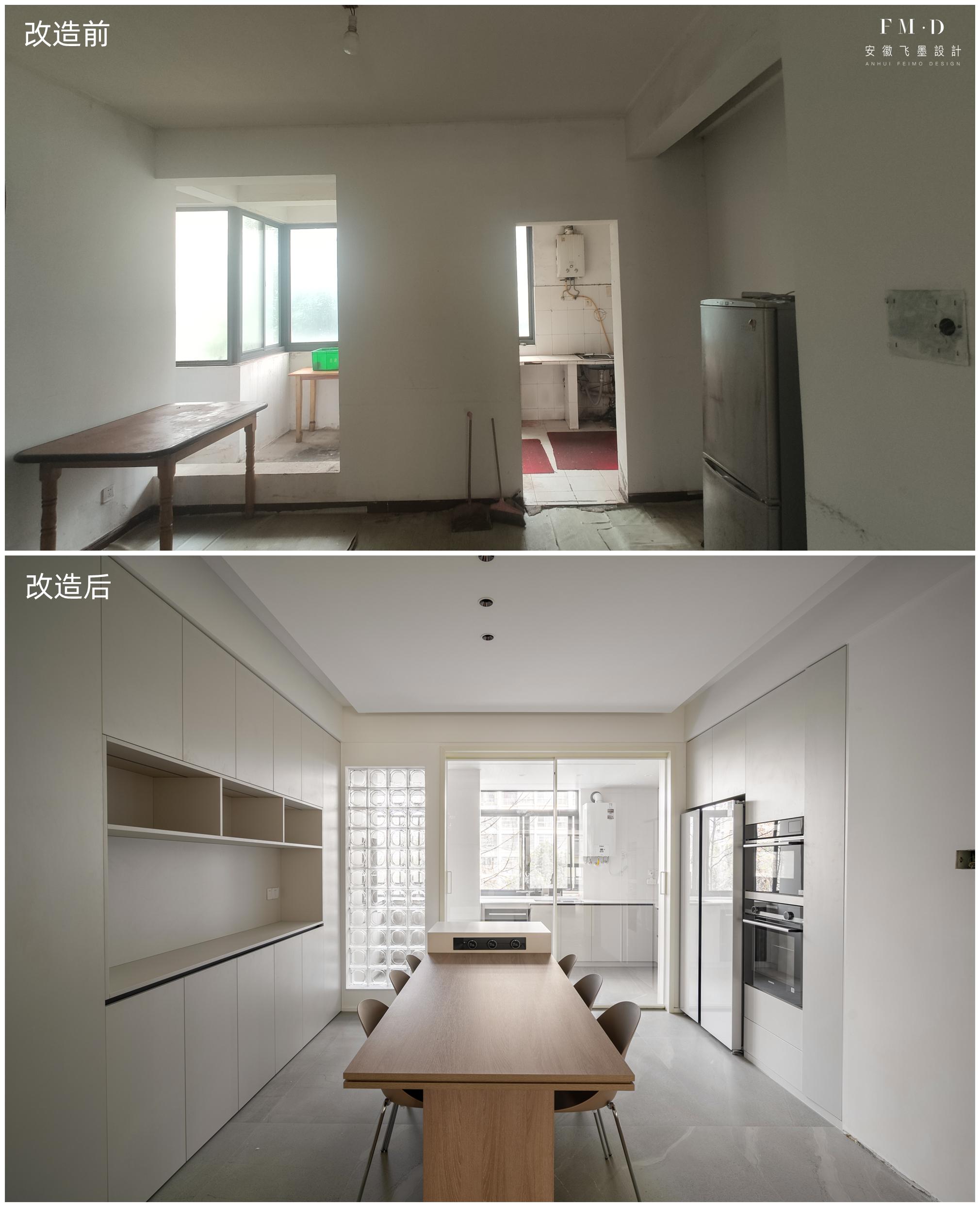 廚房改動也是個重點,原本6.2㎡的廚房打通隔壁閒置的小平臺,空間變得敞亮又實用,原本的磚砌櫥櫃全部拆掉,利用玻璃推拉門和玻璃磚牆做隔斷,通透感非常好,有種開放式的視覺感。