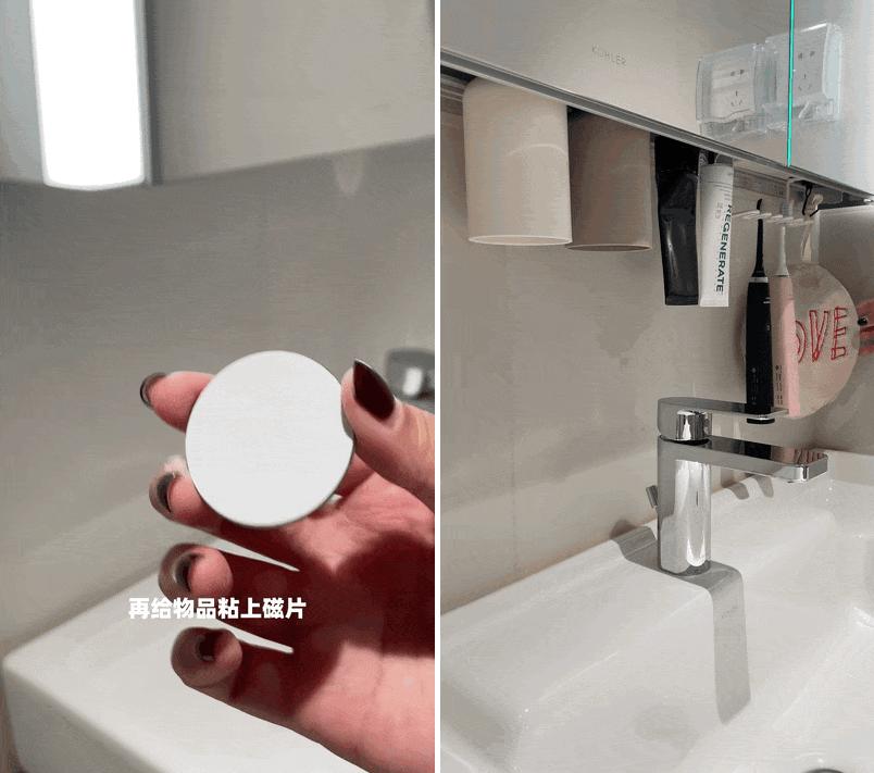 引磁片(圓鐵片)也是帶背膠的,把它貼在需要收納的物品上,例如漱口杯底部、洗面奶、牙膏蓋上,就可以利用磁力進行倒掛懸空收納了。