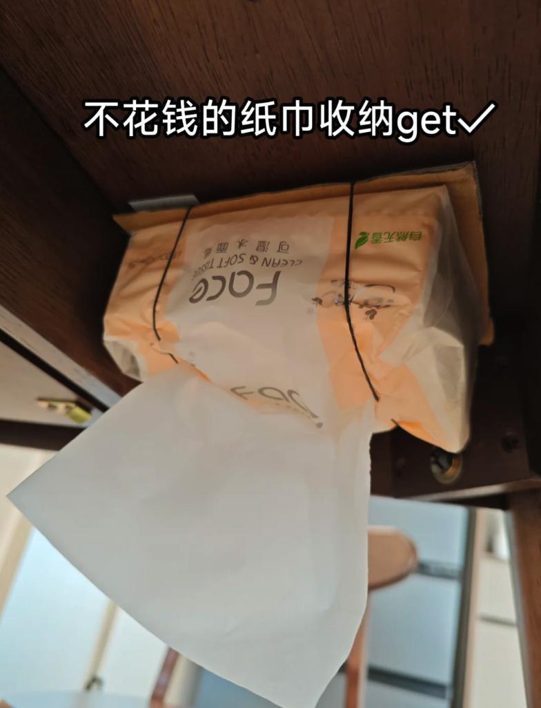 這樣弄出來的"倒掛紙巾盒"簡直不要太方便!喫完飯隨手一抽就行,完全不佔桌面空間。而且因爲是倒着放的,就算用到最後幾張也不會卡紙。換新紙巾也特別方便,關鍵是從外面根本看不見,既整潔又體面!