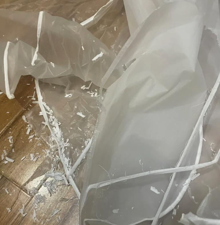 ▲花錢買的無紡佈防塵袋,反而容易掉渣