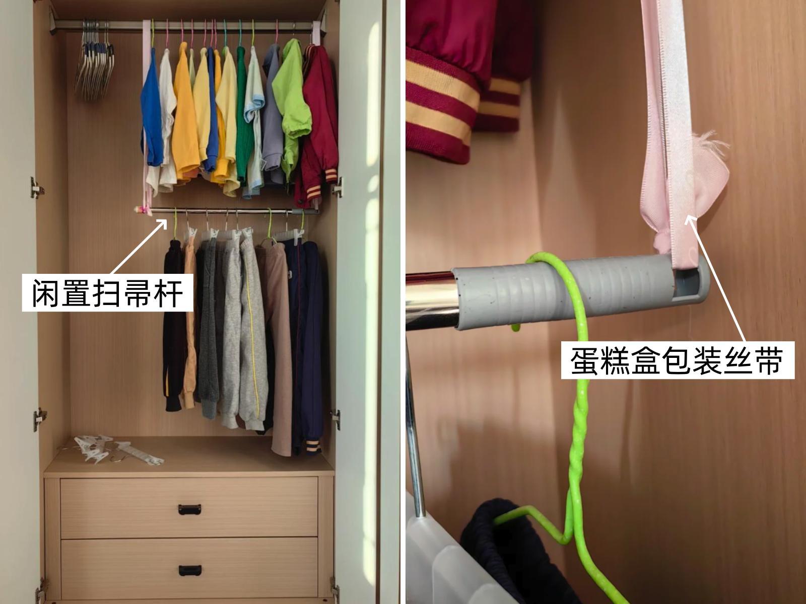 買收納抽屜吧,價格貴得肉疼。靈機一動,我把閒置的掃把手柄和蛋糕盒包裝繩組合起來,不花一分錢就DIY出一個兒童掛褲區,完美利用了閒置空間。雖然看着稍微簡陋了點,但完全不影響使用,而且關上櫃門也看不見。
