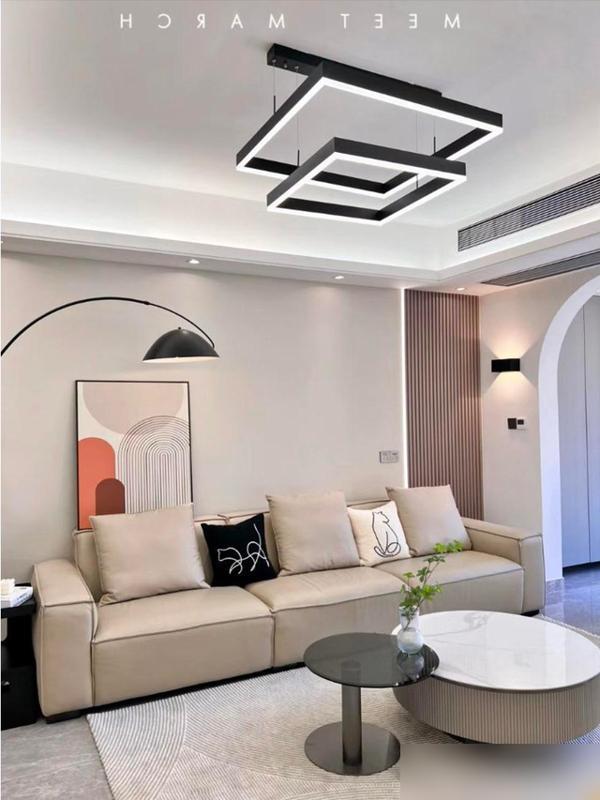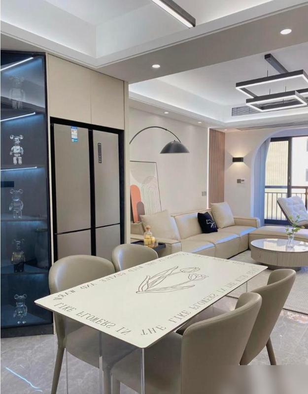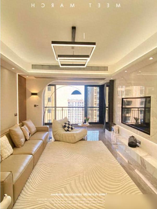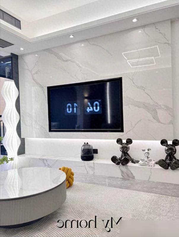 先說電視牆,巖板加乳膠漆留縫的設計,我盯着圖片看了半天——比大理石便宜不少,可高級感一點沒輸,關鍵是搭配懸空電視櫃,下邊留了足足30公分的空隙,掃地機器人鑽進去打掃完全沒障礙。