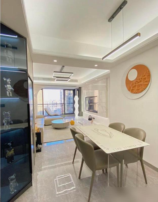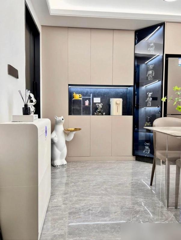 現在很多精裝房入戶門一開就是窄窄一條,放個鞋櫃都擠得慌,這對夫妻把玄關櫃和餐邊櫃連在一起,中間留空放鑰匙、掛外套,轉身就能到餐桌,動線順得很,小戶型照着抄準沒錯。