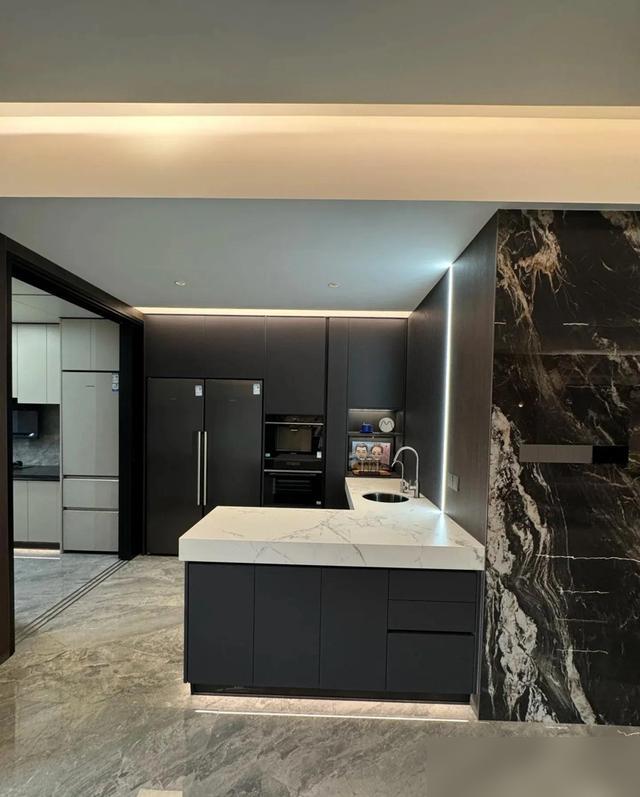廚房U型櫥櫃+雙冰箱的配置更實在,囤年貨、給娃備輔食,食材再多也不怕沒地兒塞——這哪是裝修,分明是給生活搭了個“順手”的框架。
