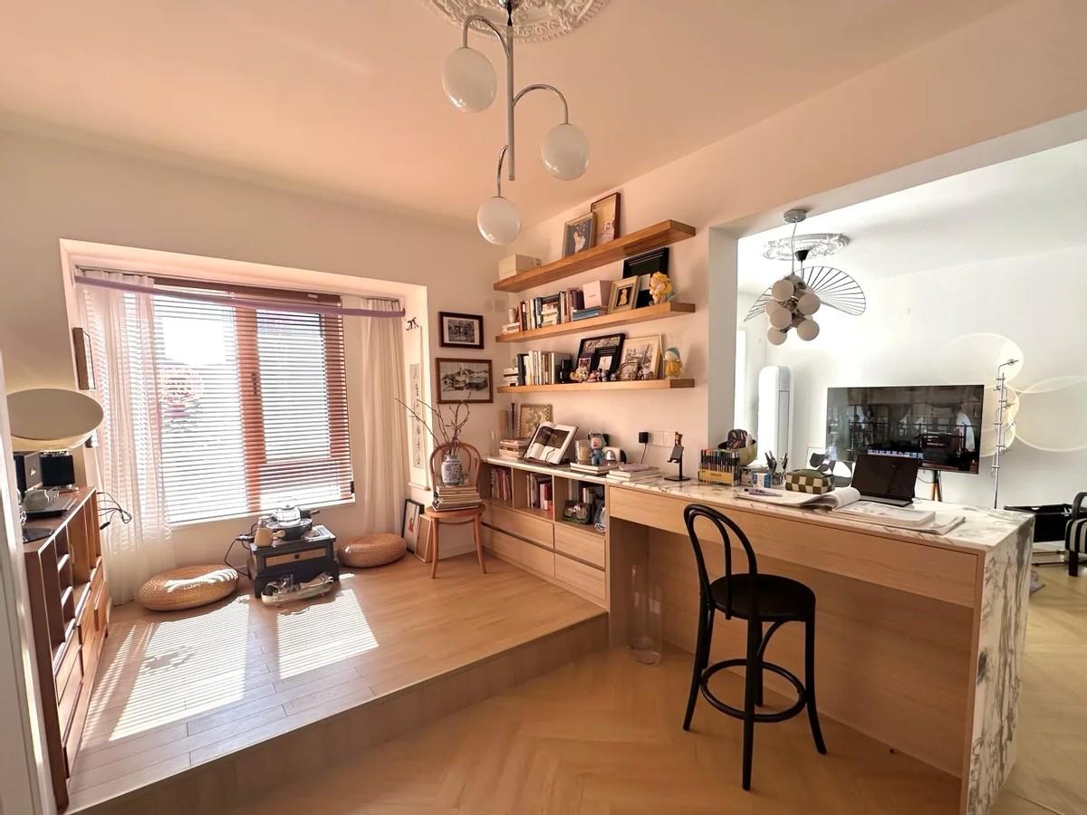次臥的地面,大部分做了個地臺。在地臺上面鋪上墊子,其實就是個牀。而旁邊就設置的書桌。即使家裏來了客人,次臥也可以改成客房。