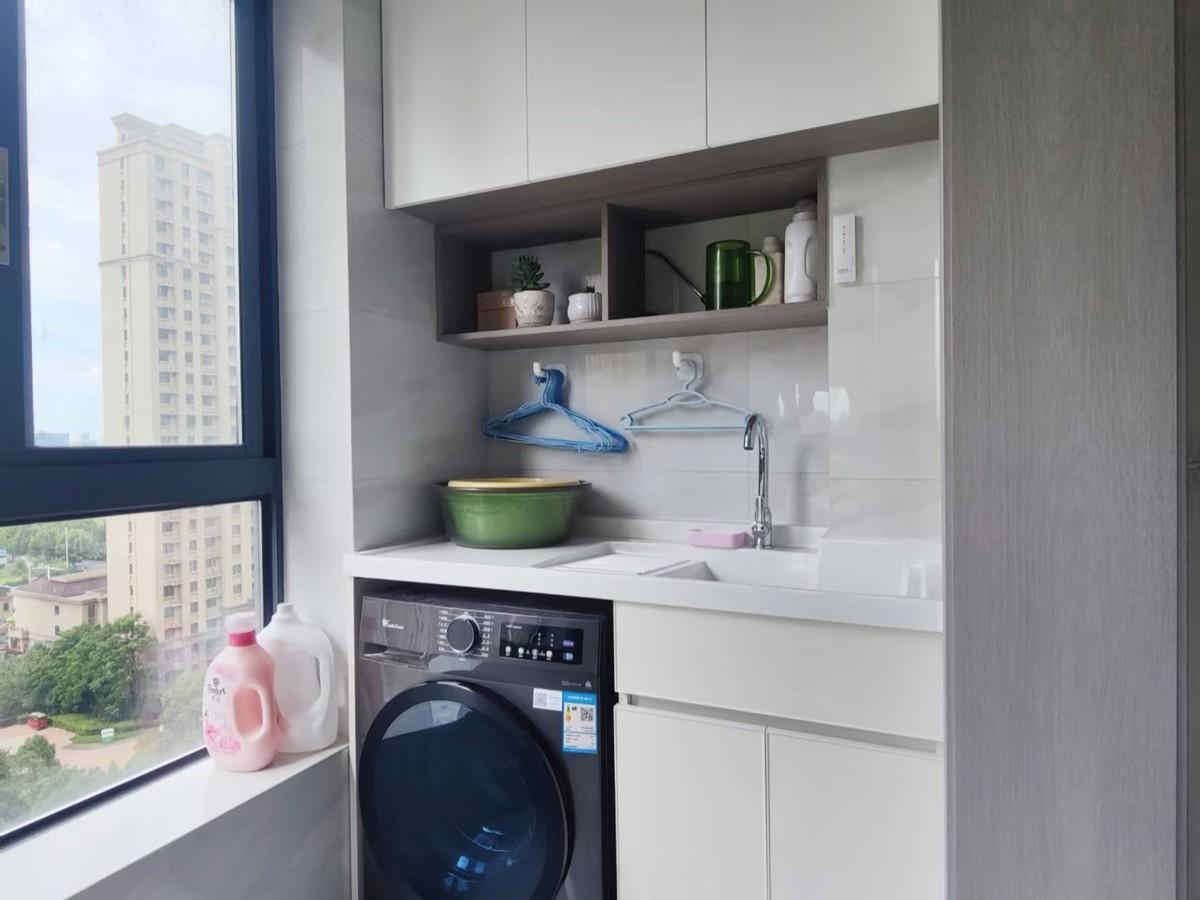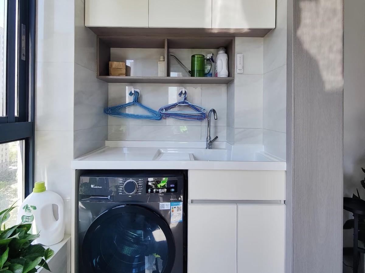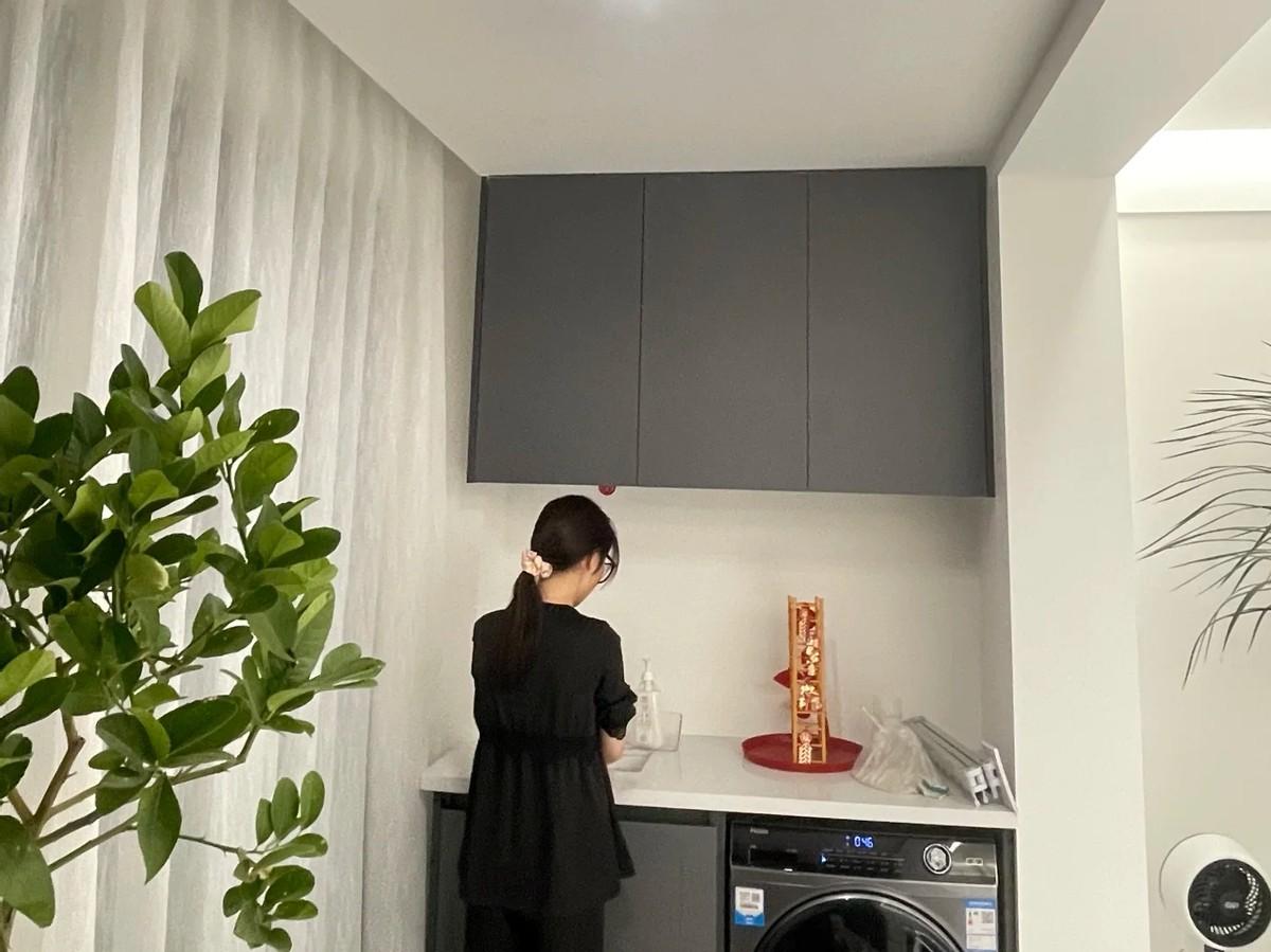 而把洗漱臺整個挪到了陽臺洗衣機伴侶櫃的位置。在陽臺打造了一個洗漱區,旁邊是安裝的洗衣機,洗衣機的上面以及側面安裝了洗漱臺。