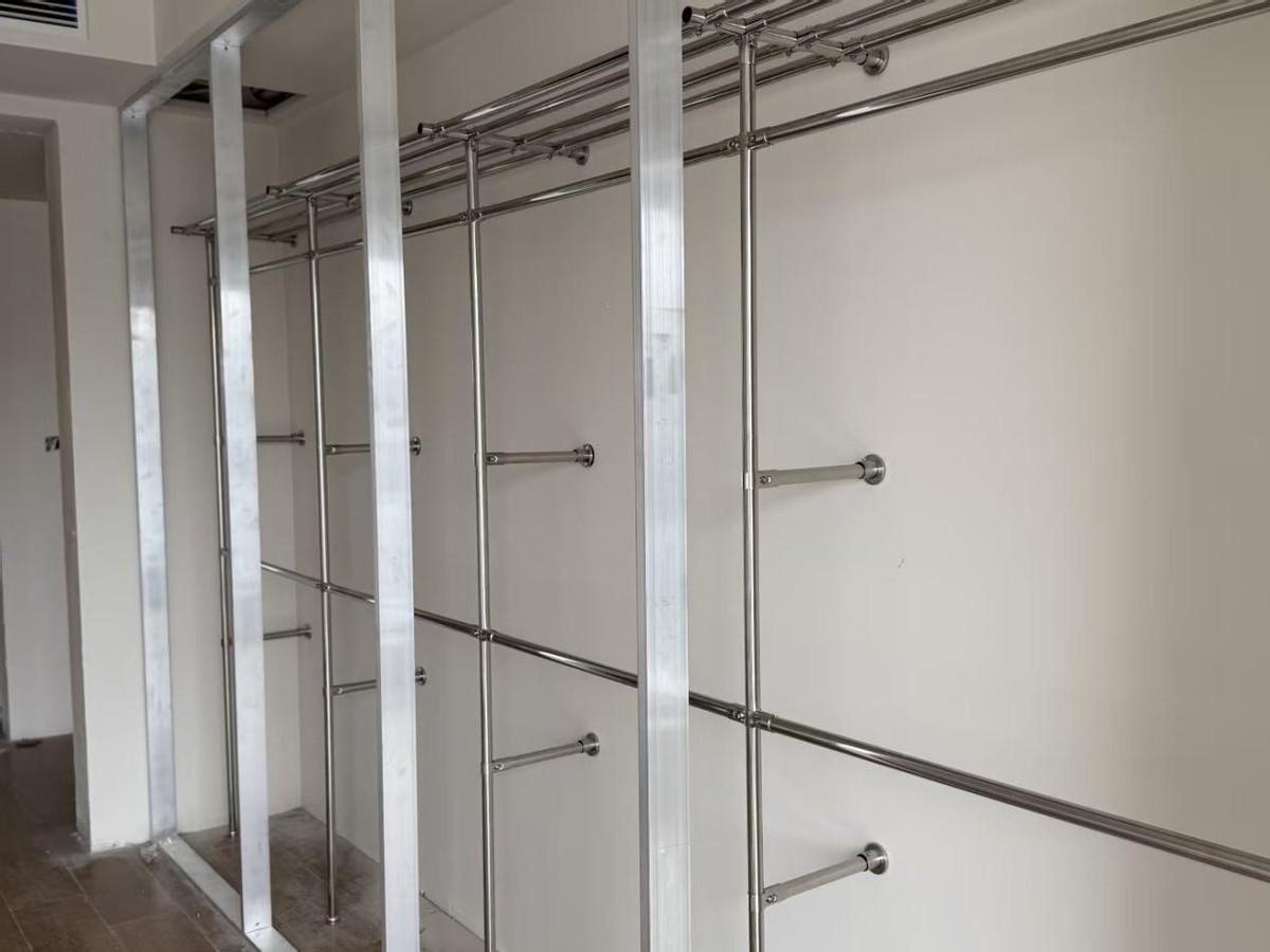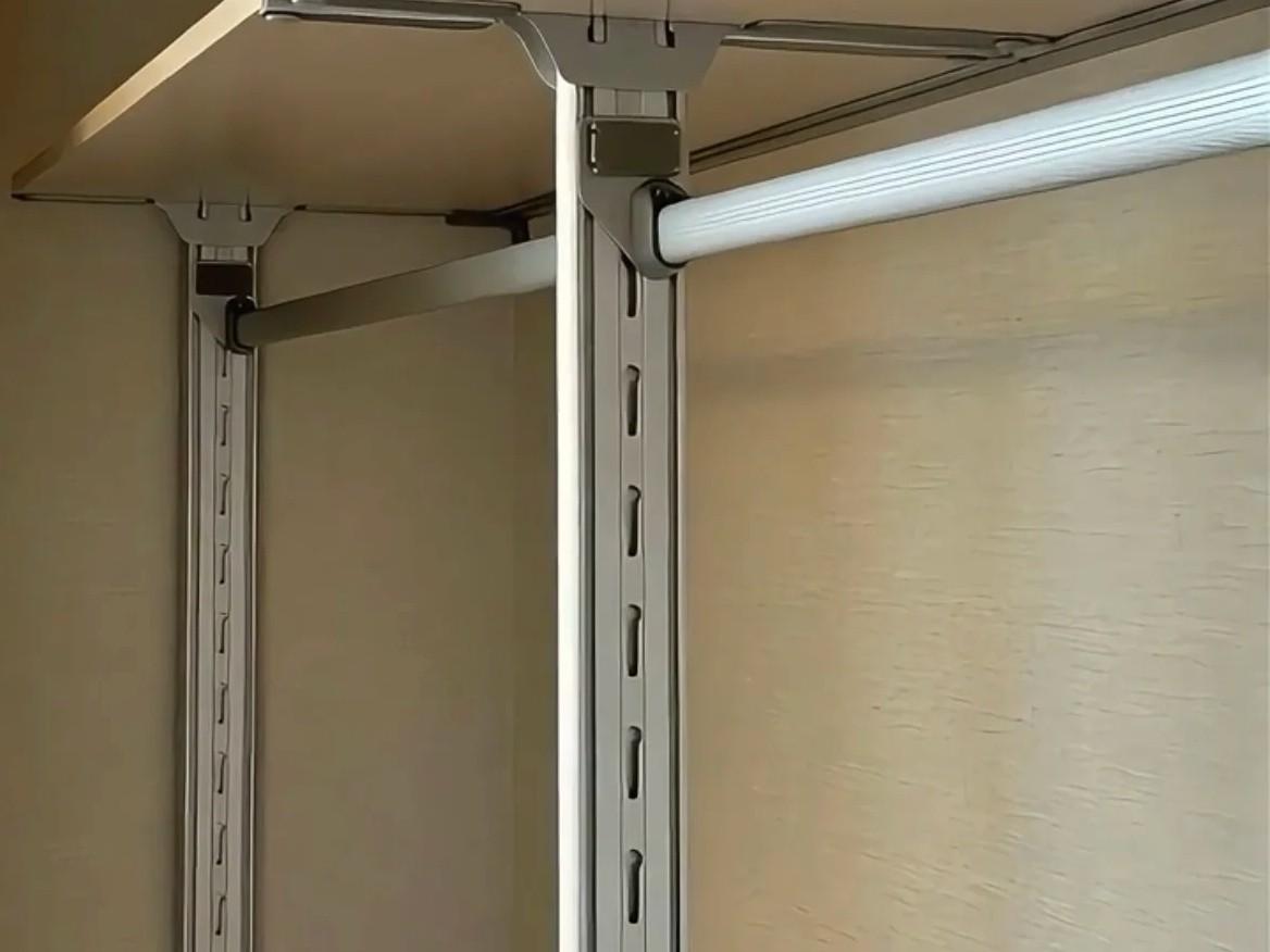 在衣櫃內部幾乎是沒有任何層板的,都是鋁合金的型材,然後組裝成的掛衣杆。而且,這些掛衣杆,是可以調節的,根據衣服的長短可以上下移動。