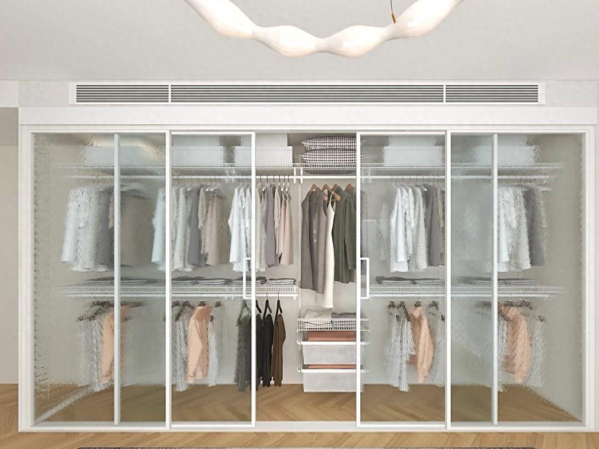 衣櫃放棄了傳統的板材衣櫃,而是選擇了目前非常流行的鋁合金框架衣櫃。