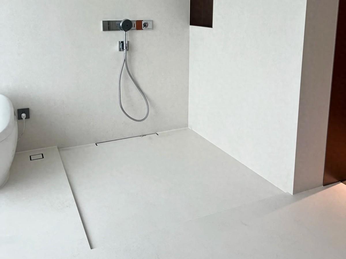 淋浴間採取了無障礙下沉設計。無淋浴間的地面,比淋浴間以外的衛生間地面,低了大概兩公分。而從淋浴房區邊緣向內,是找的斜坡,沒有出現2公分的臺階,所以就形成了無障礙下沉淋浴間。