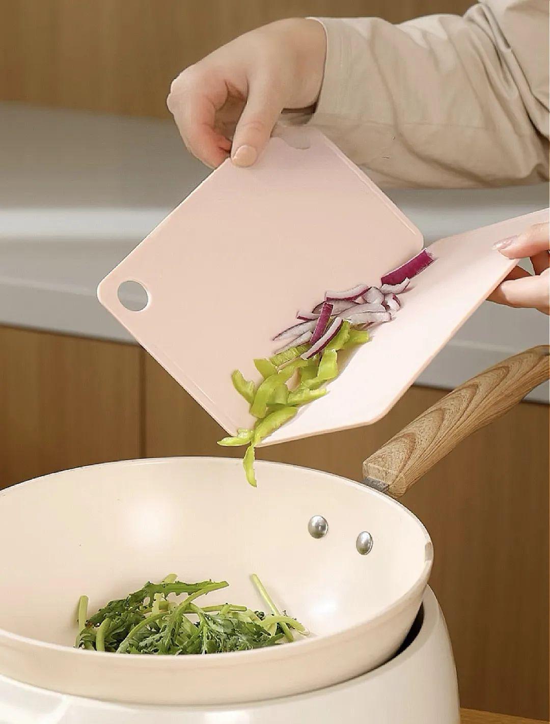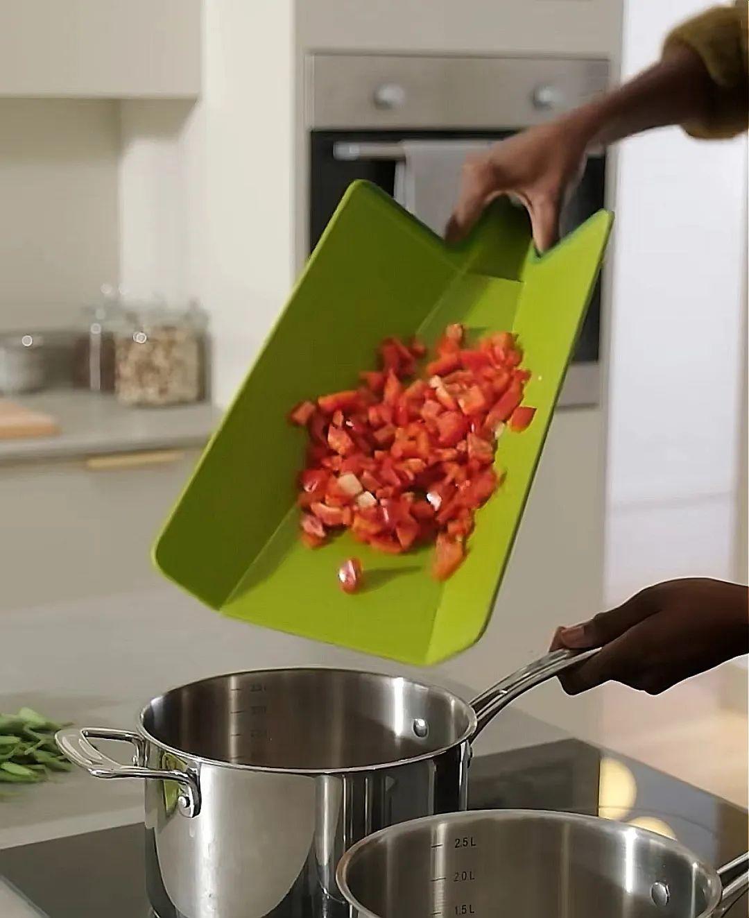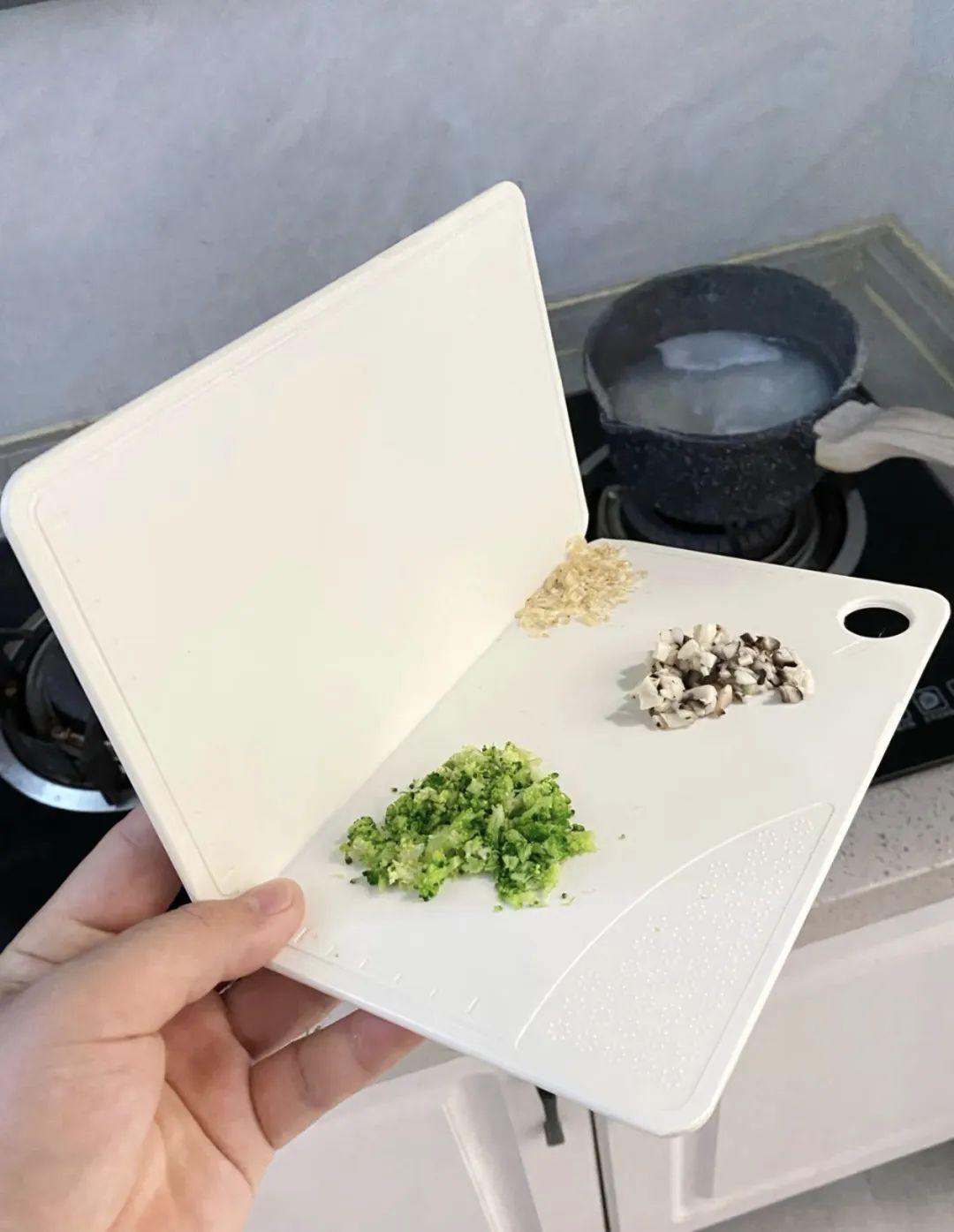 切完菜時將其摺疊,可摺疊菜板直接以自己爲託板,一次性將菜全部送入鍋中!
