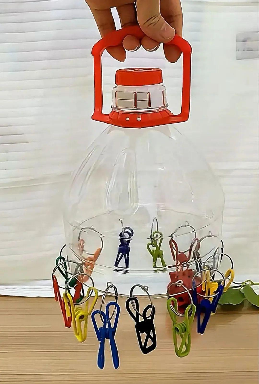 將油桶下面裁去,只留油桶的上1/2或1/3,再將所留部分下面一圈按合適間隔戳上小孔,把帶小掛鉤的夾子勾在小孔上,一個曬襪子神器就誕生了。