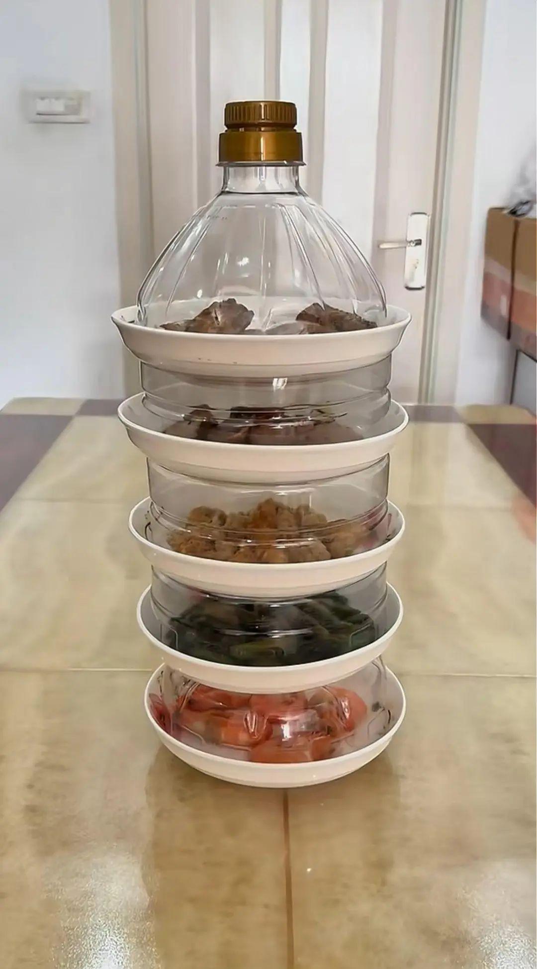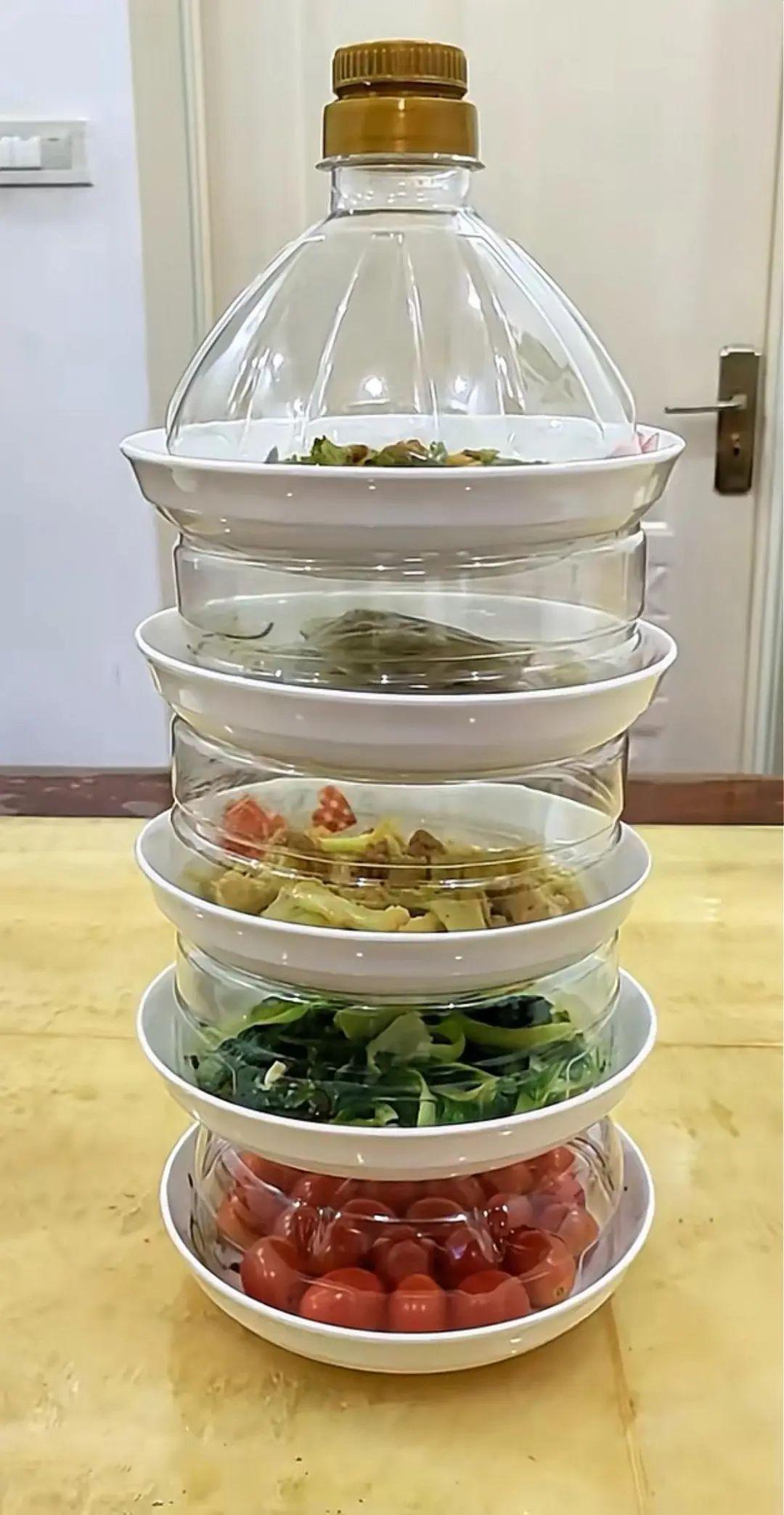 將油桶按照其紋路裁剪成各個小分段,直接將各個小分段罩在盛飯菜的盤子上,再將另一個盛着飯菜的盤子放到油桶小分段之上,再疊蓋上一個油桶小分段。