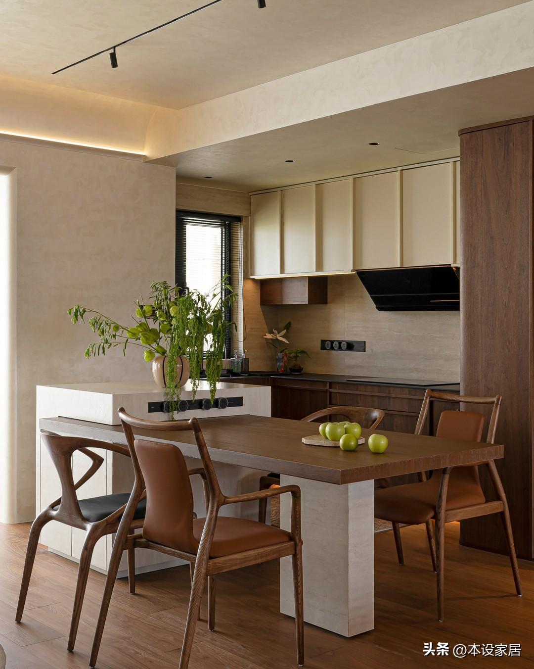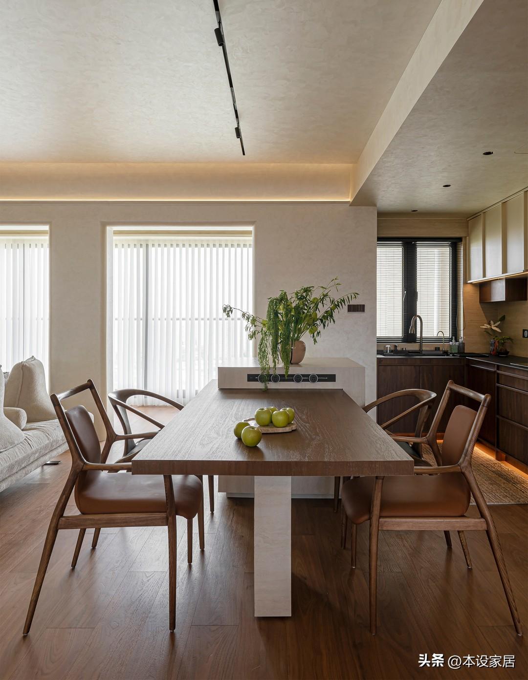 餐廳則選用實木餐桌椅,搭配白色島臺,不僅增加了空間的明亮度,還提升了整體的質感,營造出一份愜意且溫馨的就餐氛圍。