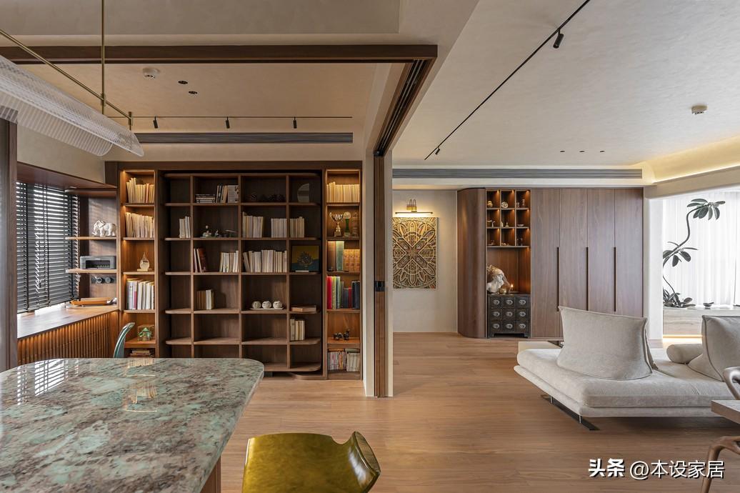 書房的設計同樣延續了原木色的主調,靠牆定製一組實木收納櫃,把書籍和裝飾品有序地納入其中,讓整體空間的調性高度統一。