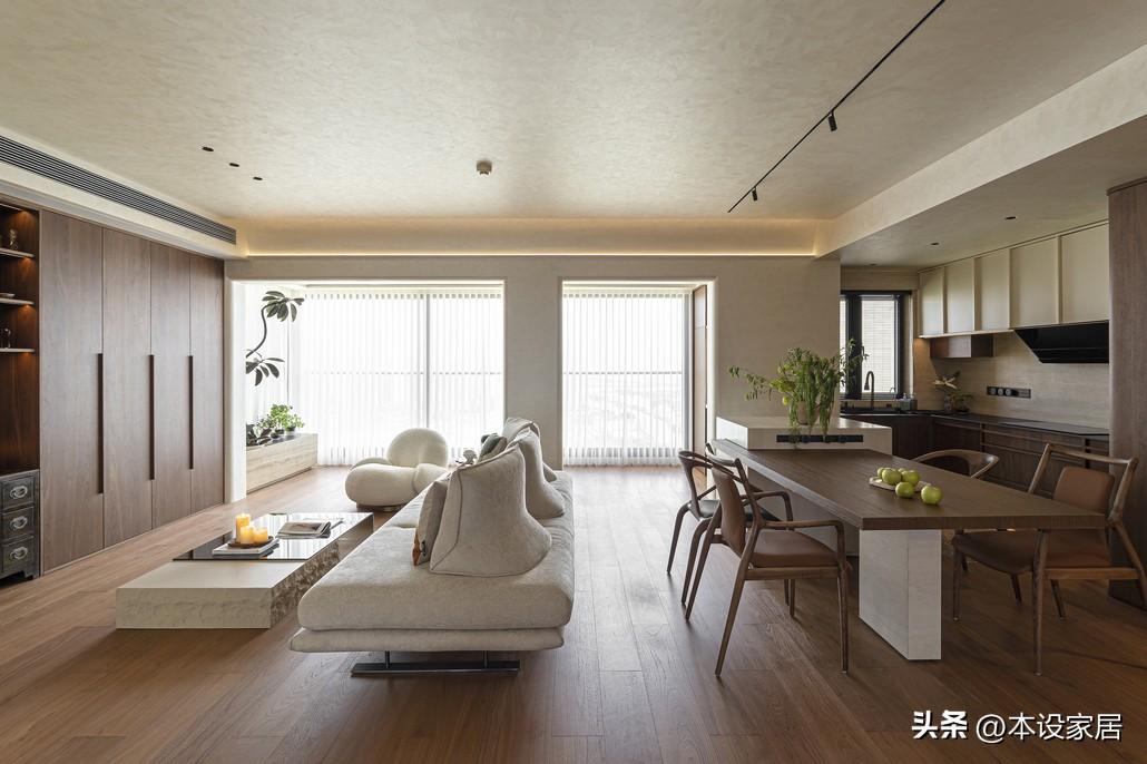 客餐廚地面鋪設實木地板,沒有電視背景牆,而是定製一組有開有合的原木色儲物櫃,天花暗藏的投影幕,滿足屋主觀影的需求。