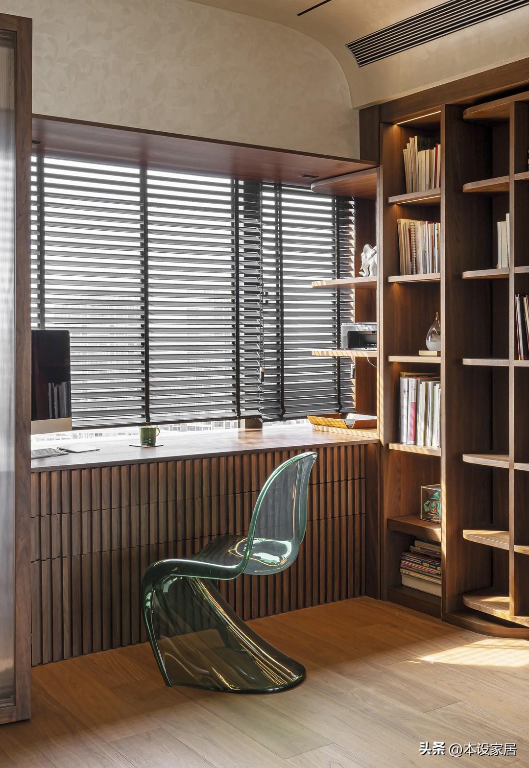 同時,利用窗臺打造書桌,搭配原木色百頁窗簾,打造出一個既具歷史韻味又充滿現代功能的學習與工作空間。