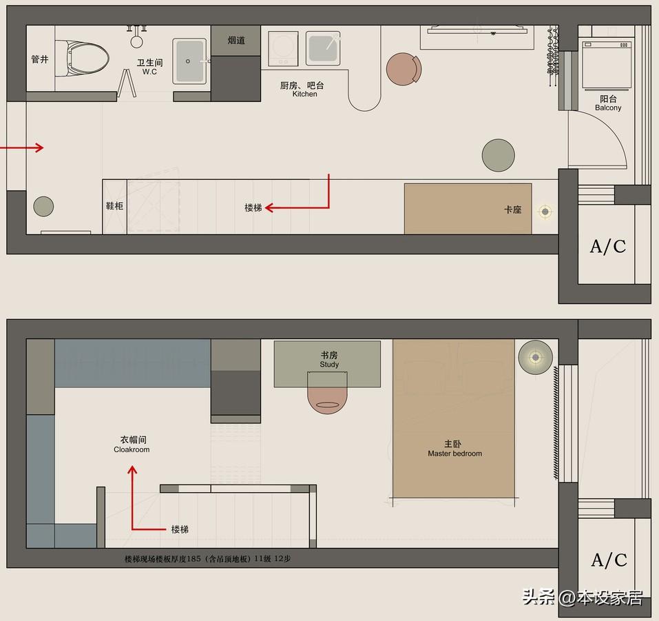 根據小姐姐的生活習慣和需求,以及層高優勢,將空間分爲兩層: