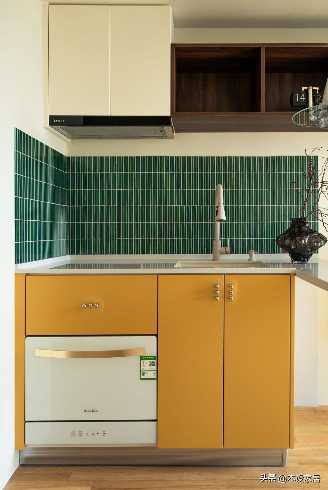 小小的洗碗機,嵌入式安裝到棕黃色的地櫃中,精緻整潔又實用,搭配綠色小塊牆磚,營造出一種優雅的復古感。“雨過天晴雲破處,這般顏色做將來”,是宋人對天青色的描繪,也正如小姐姐對這個小家未來的期盼。