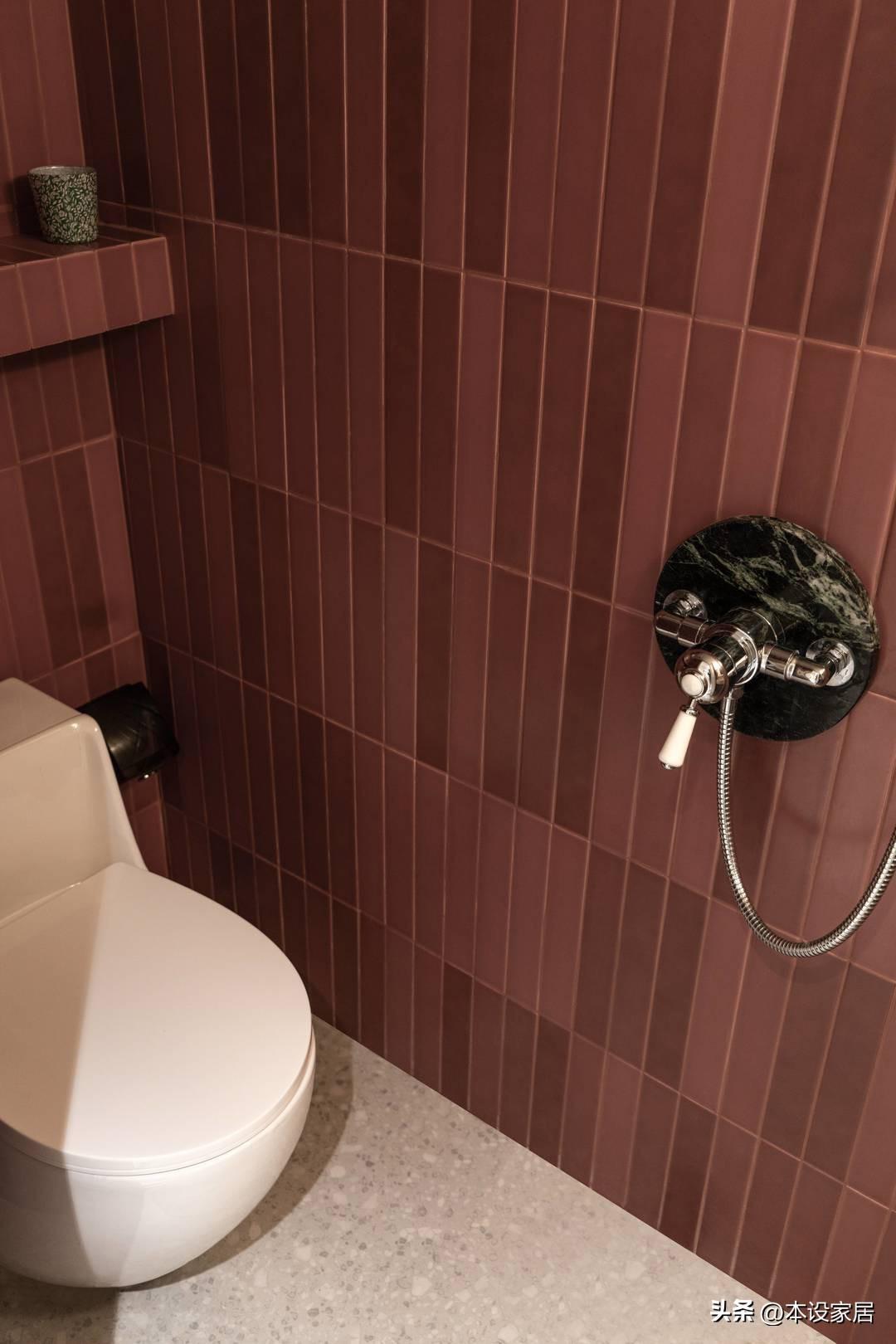 地面和玄關一樣,鋪貼水磨石,牆面則貼低飽和度的磚紅,溫潤又沉穩。同時,在馬桶上方砌出牆垛,用於置物,極致利用空間。