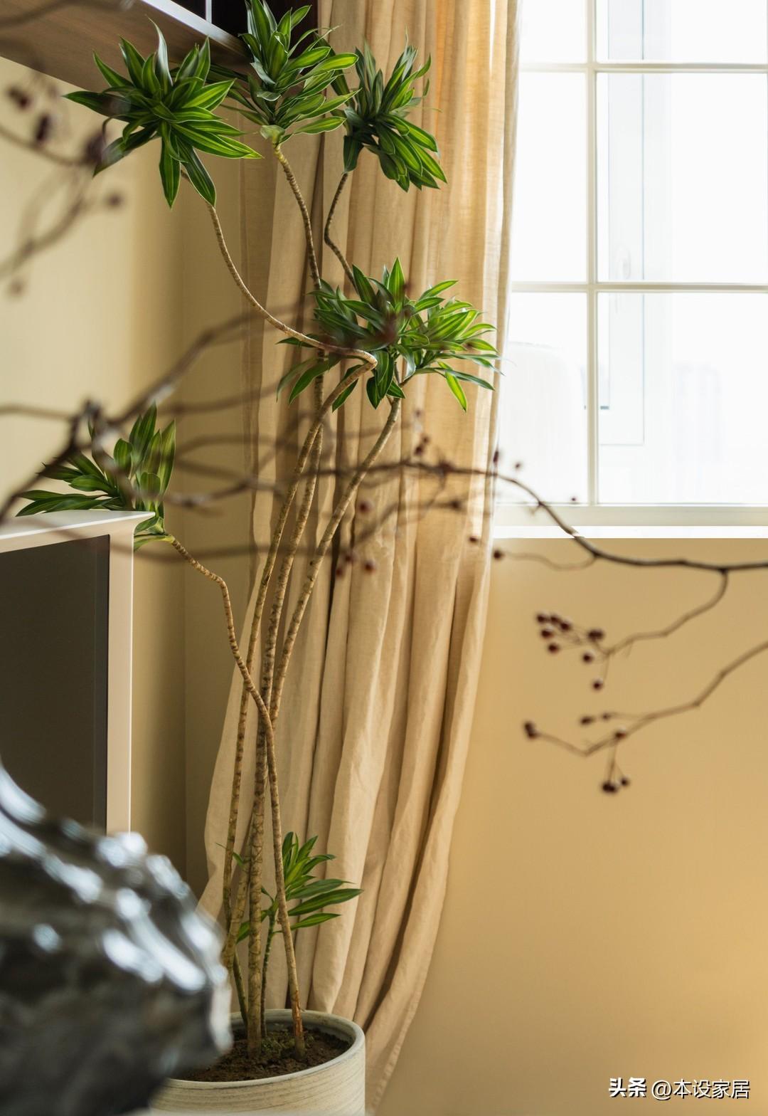 而窗簾材質則選擇粗麻材質,在一抹綠植的點綴下,有一種度假的感覺。