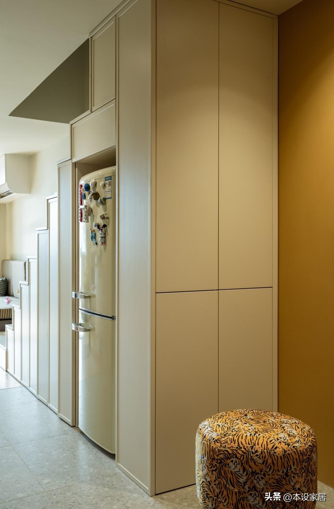 這種設計不浪費空間,將冰箱和行李箱、紙品、五穀雜糧等生活用品有序地納入地其中,拿取,不用去房間上上下下地折騰了。