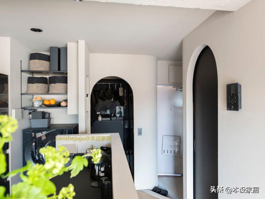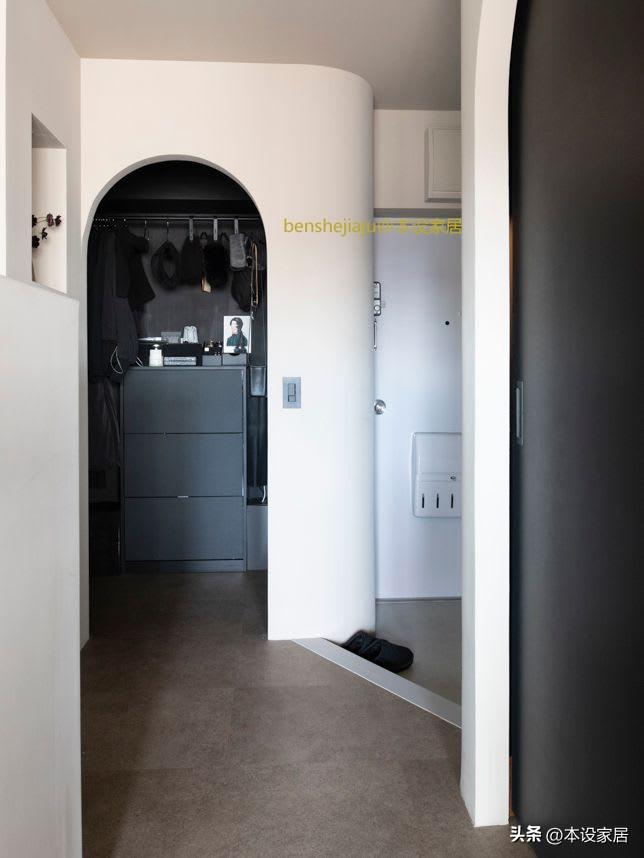 衣帽間牆地面、收納櫃和衣架全部是深灰色的,營造一種縱深感,看起來也很高級,再加上採用拱形門洞設計,增加了空間的柔和感。