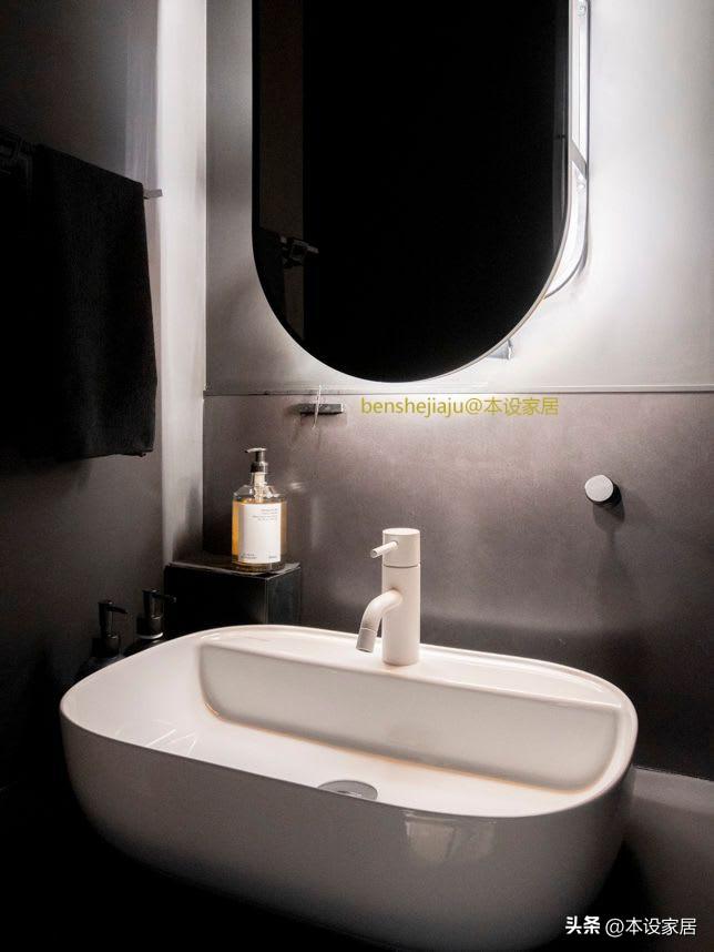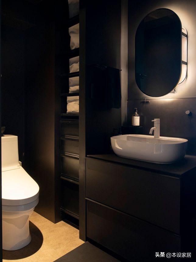衛生間地面鋪設米黃色瓷磚,牆面、天花和收納櫃同樣採用深灰色,收納做到了盡善盡美,非常適合獨居。