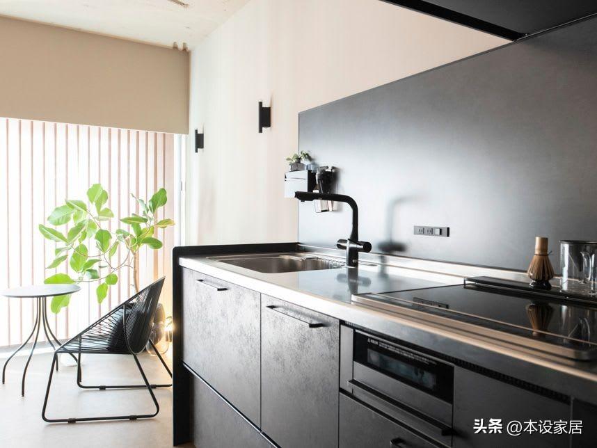 再看看廚房,採用II型佈置,提供更多的操作檯面和儲物空間,把廚房用品有序地收納到抽屜櫃裏,竈臺上空無一物,乾淨的像還未入住的新房。