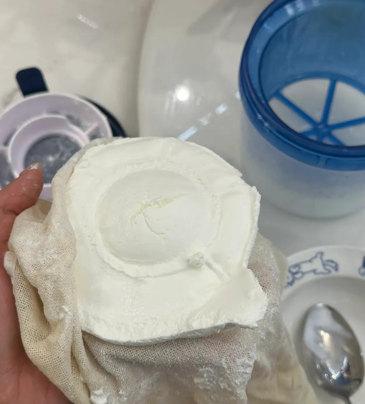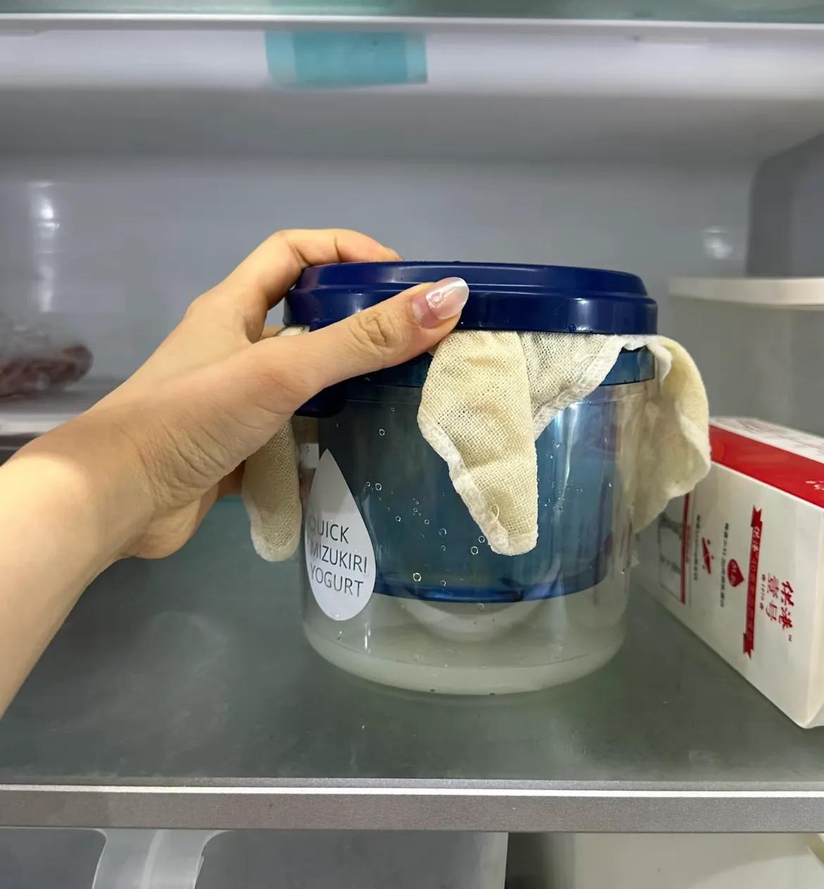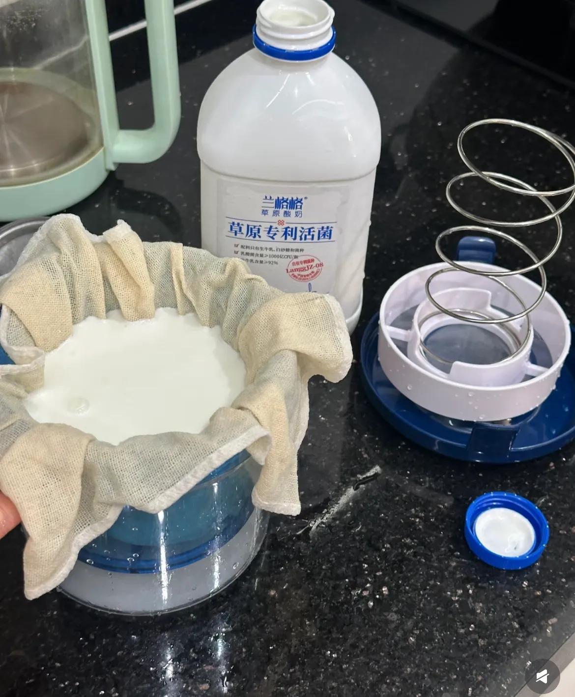 做幹噎酸奶時,把它套在容器上,靜置幾個小時,奶酪狀的乾巴酸奶就出來了。