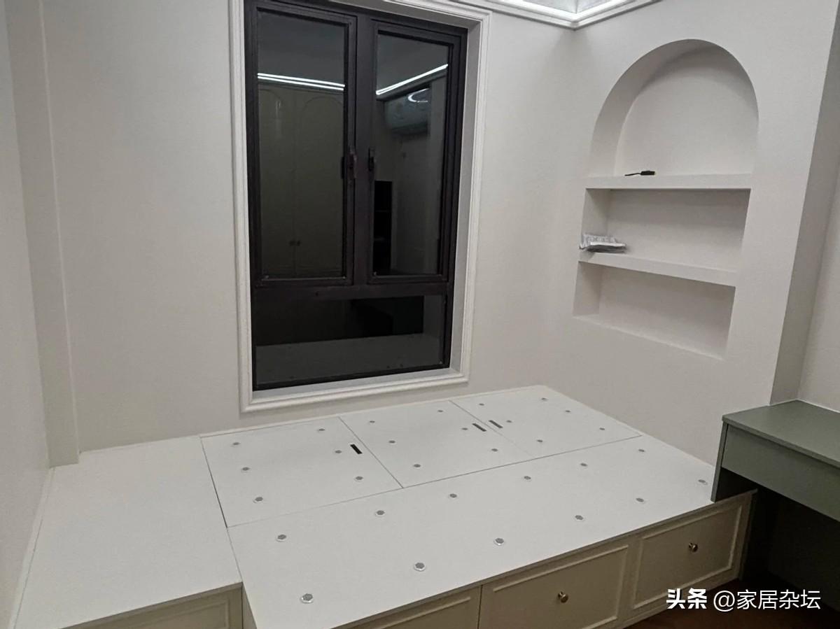 地臺牀做法也很簡單,就是在小臥室的地面,使用板材做了一個大約有10公分高的地臺。這個地臺,從窗戶一直向外延伸,接近有2.5米寬。