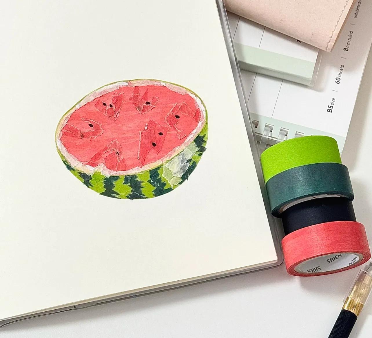 最近的拼貼都是水果,用膠帶做了西瓜,我儘量把相近顏色貼在一起,這樣就能看出區別,整體挺逼真,夏天就是要大口吃瓜。