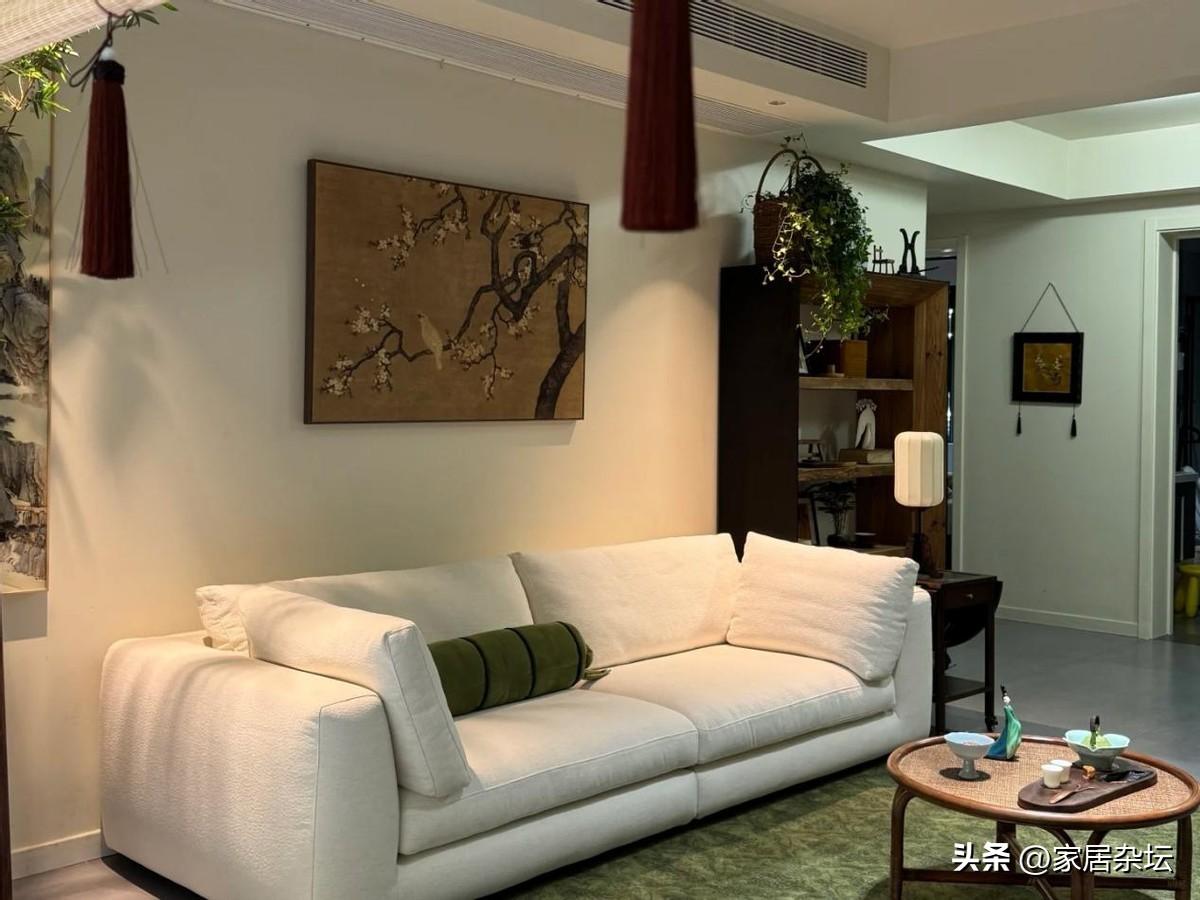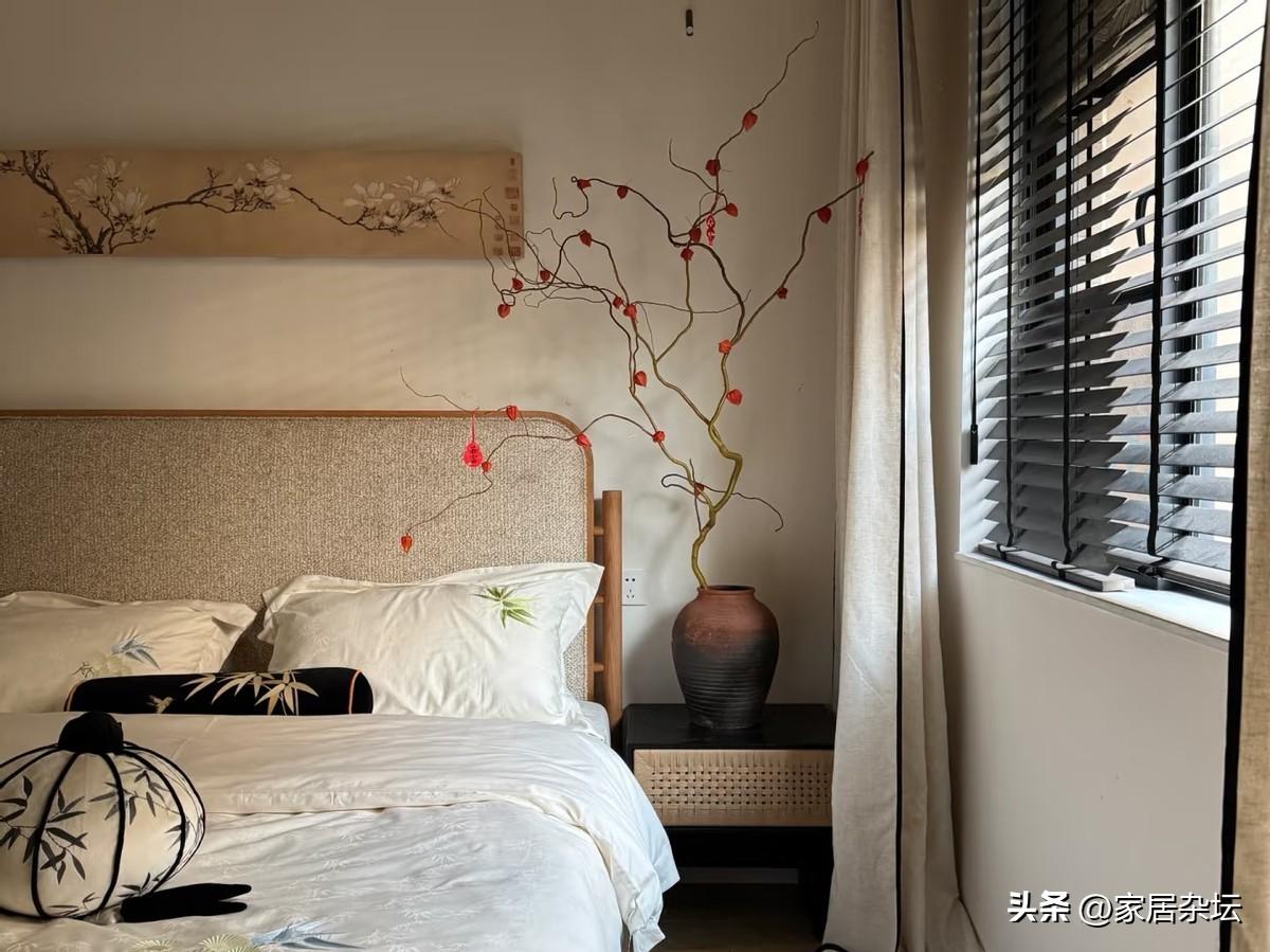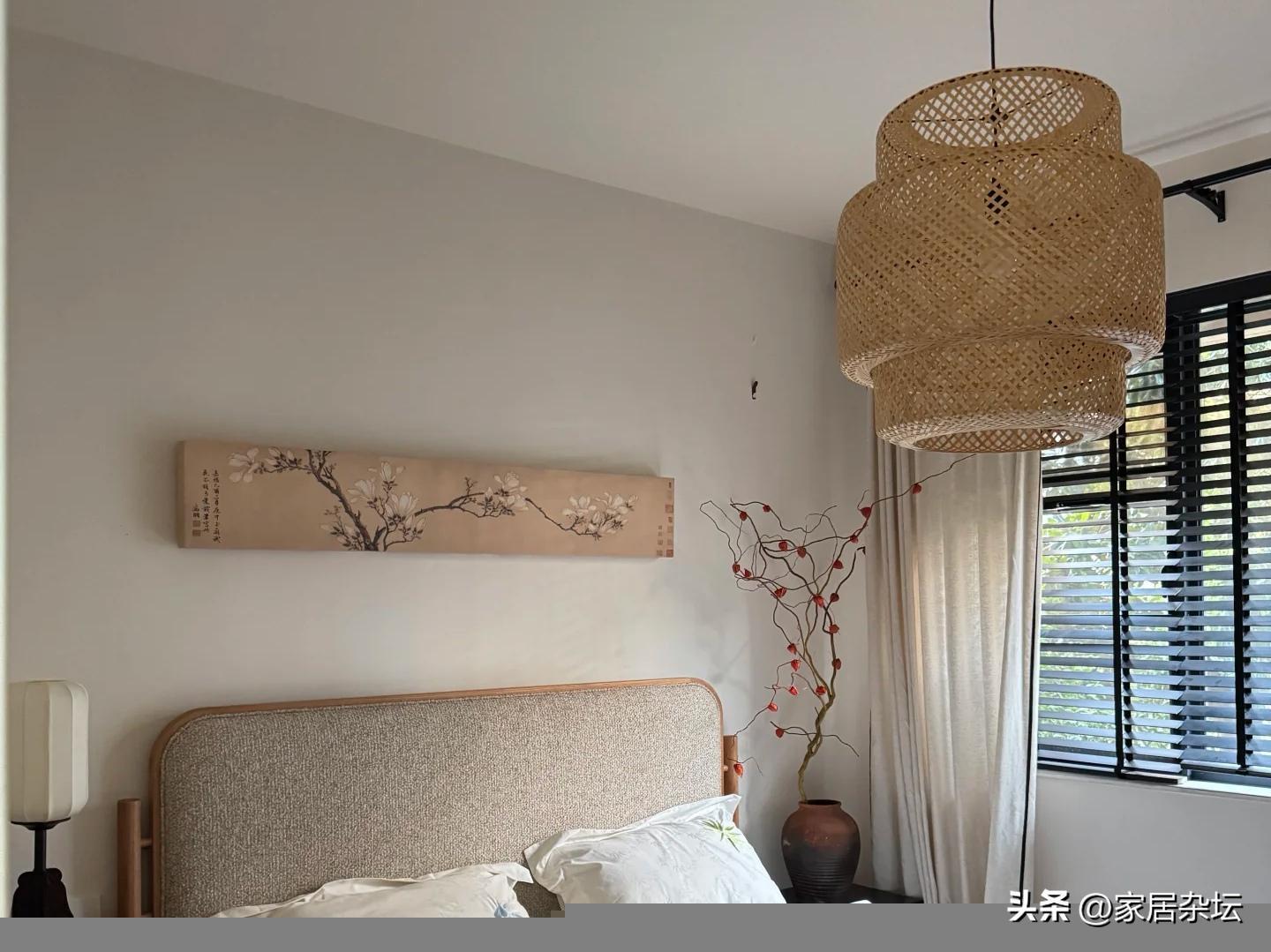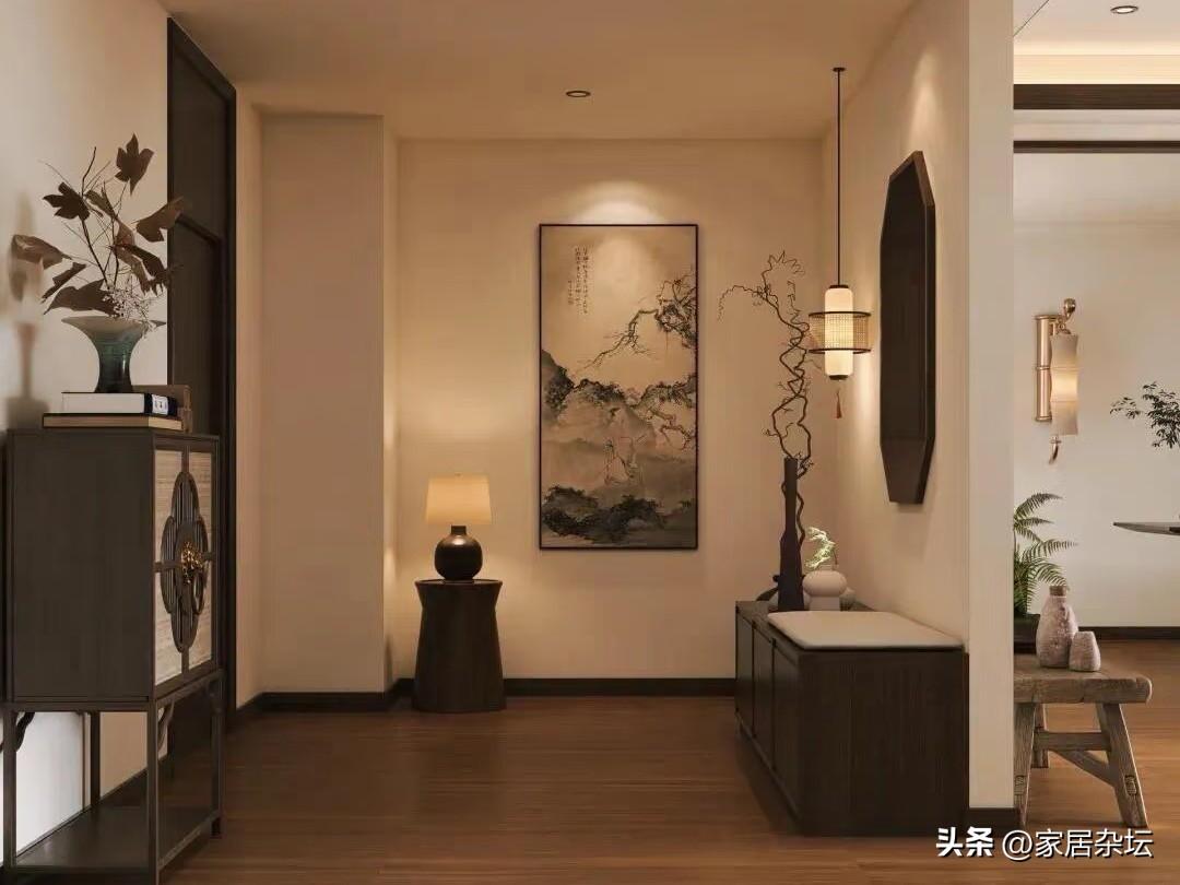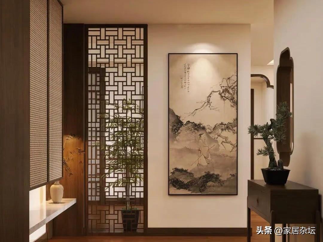 而在軟裝細節中,要注意掛畫、燈具和綠植。其中掛畫,儘量選擇水墨山水或者是花鳥畫。如果裝裱,可以採用細木框或者是絹木卷軸。而燈具也很重要,可以選擇紙燈籠,竹編吊燈,光源暖黃例如2700~3000K,避免強光。在搭配上綠植點綴,小型的文竹、菖蒲盆景,還可以在瓷花瓶裏插花等等。