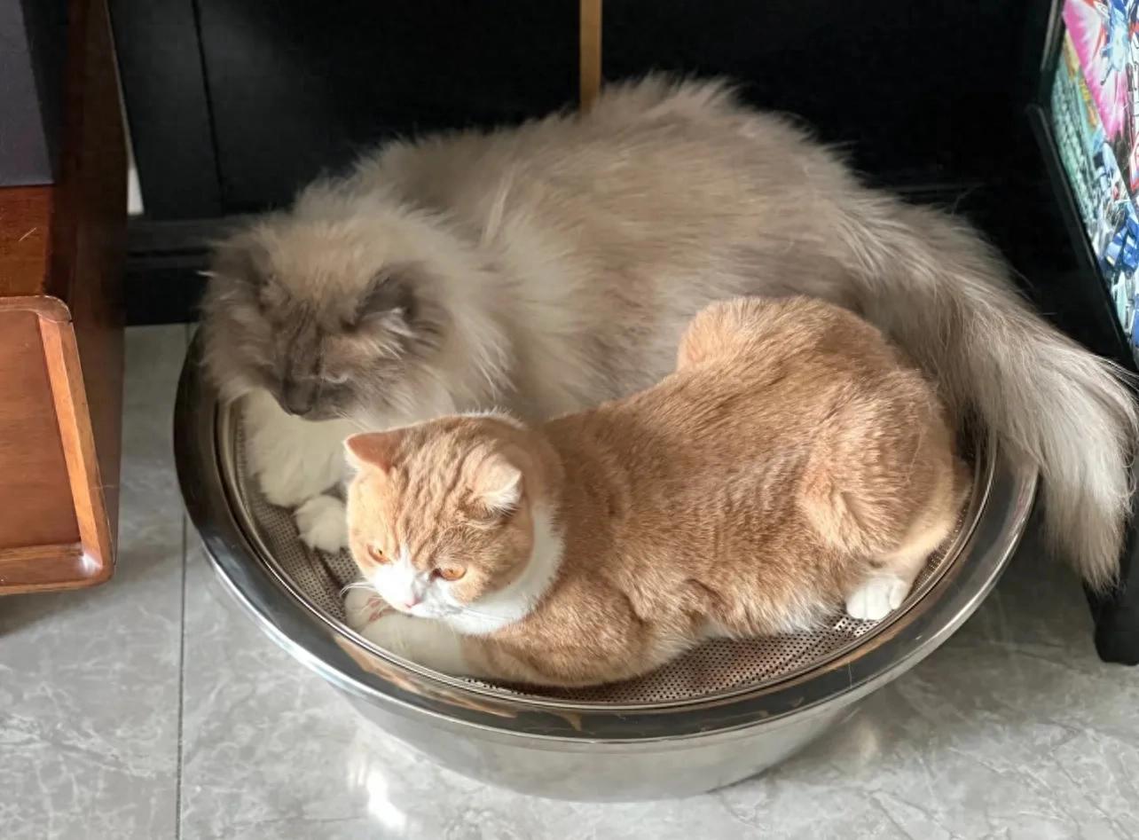 用不鏽鋼盆加上不鏽鋼網孔圓盤,在底下放冰塊,打造屬於貓咪的專屬空調房,降溫、省錢都有了。