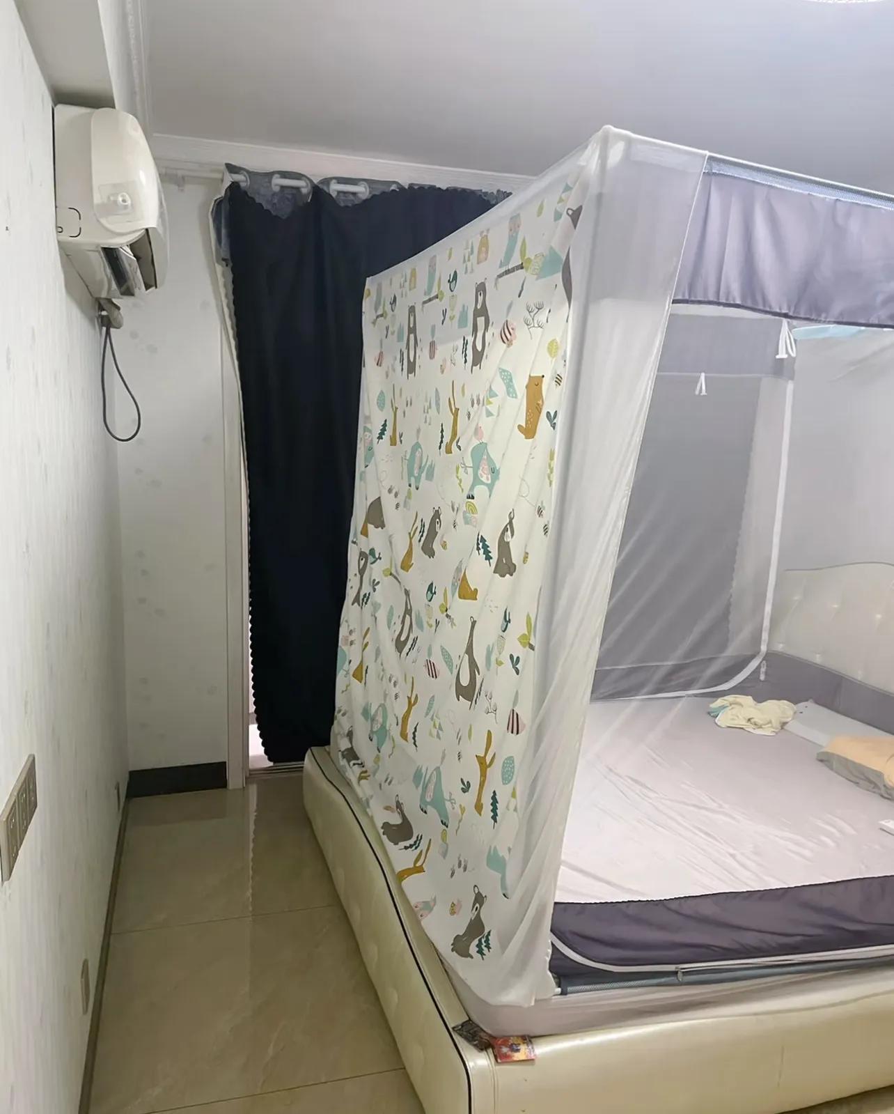於是乎,用牀單把蚊帳的一整個面擋起來,這樣牀上就不會有風直吹了,調到合適溫度開一整晚特別舒服,終於不用半夜起來調空調溫度了。