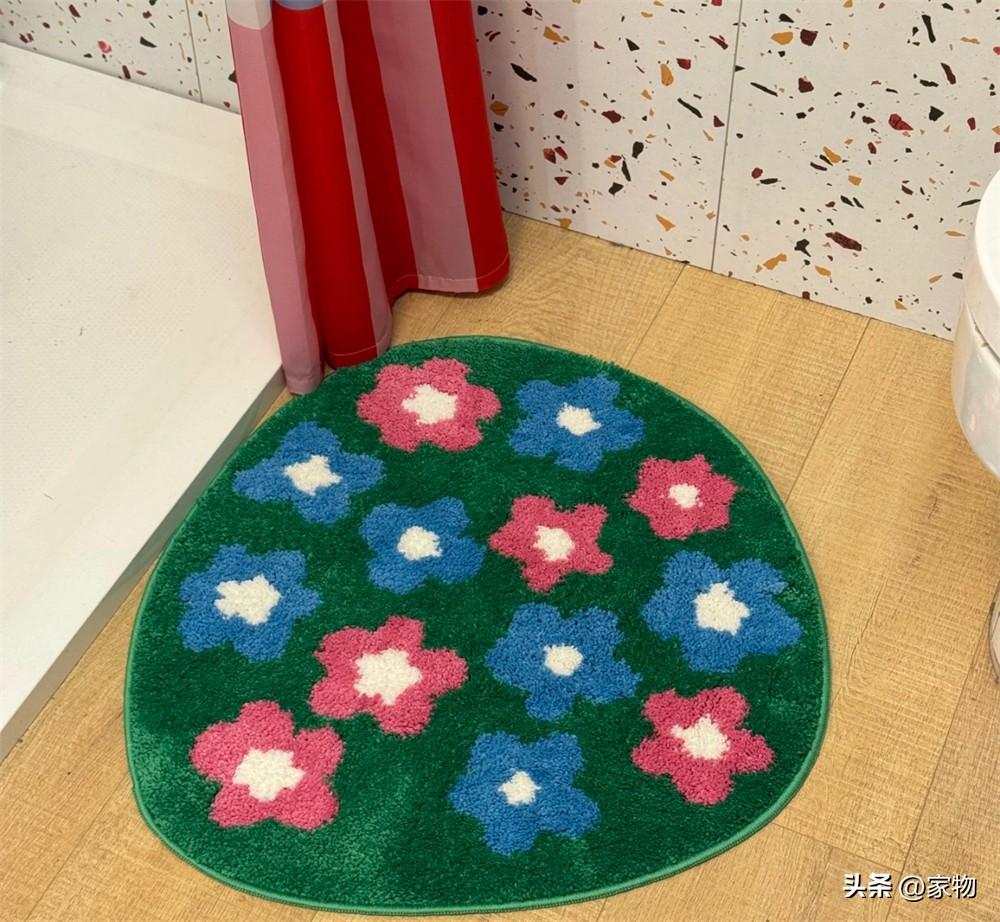 一個造型不規則,形似鵝卵石的地墊,上面印滿小花花圖案,真的是少女心滿滿,同時也很剋制地沒有增添其他元素,看上去不至於顯得雜亂。